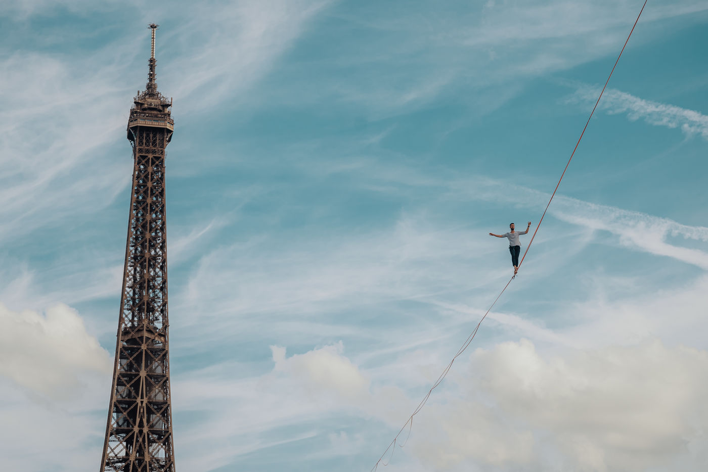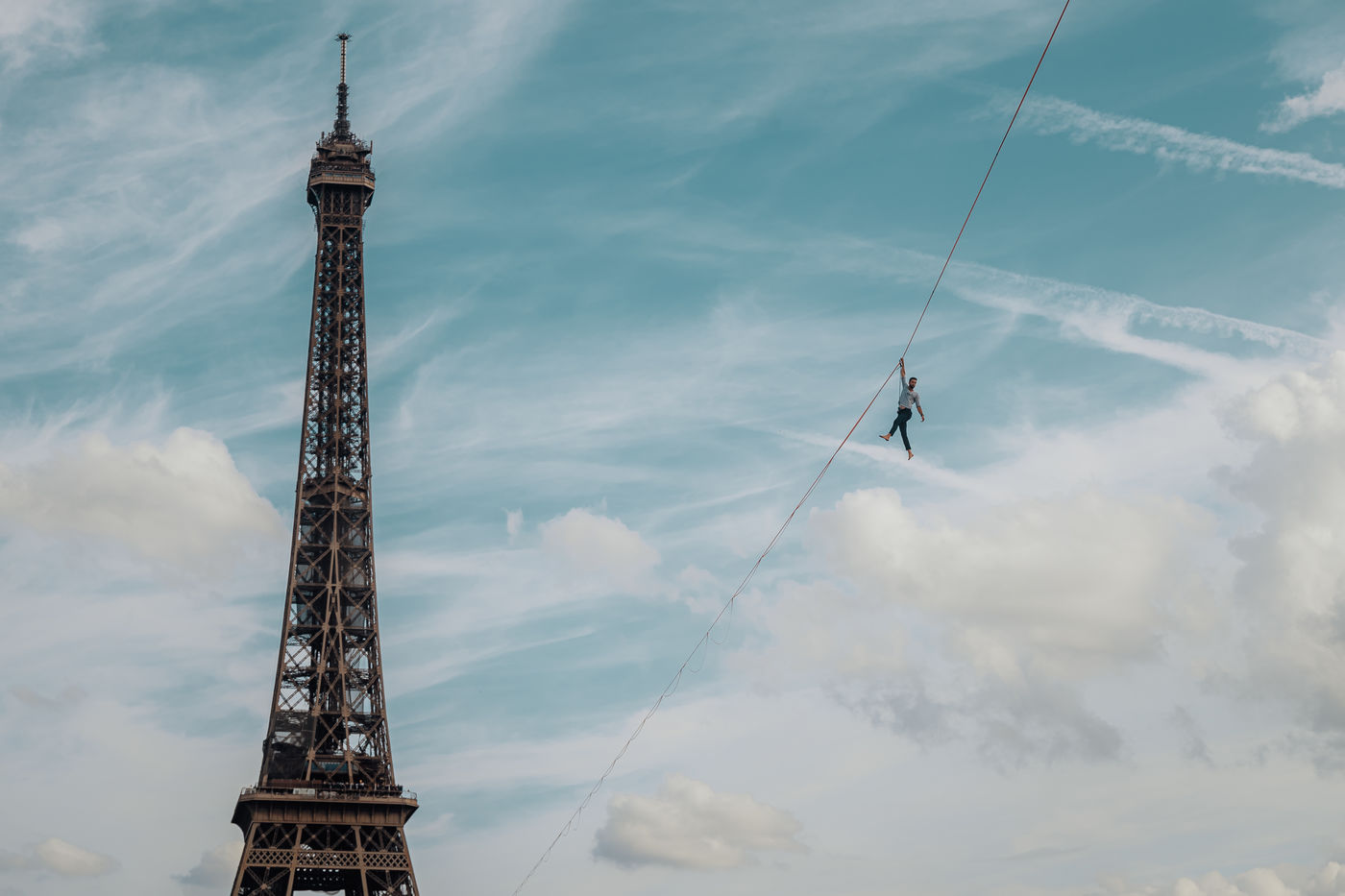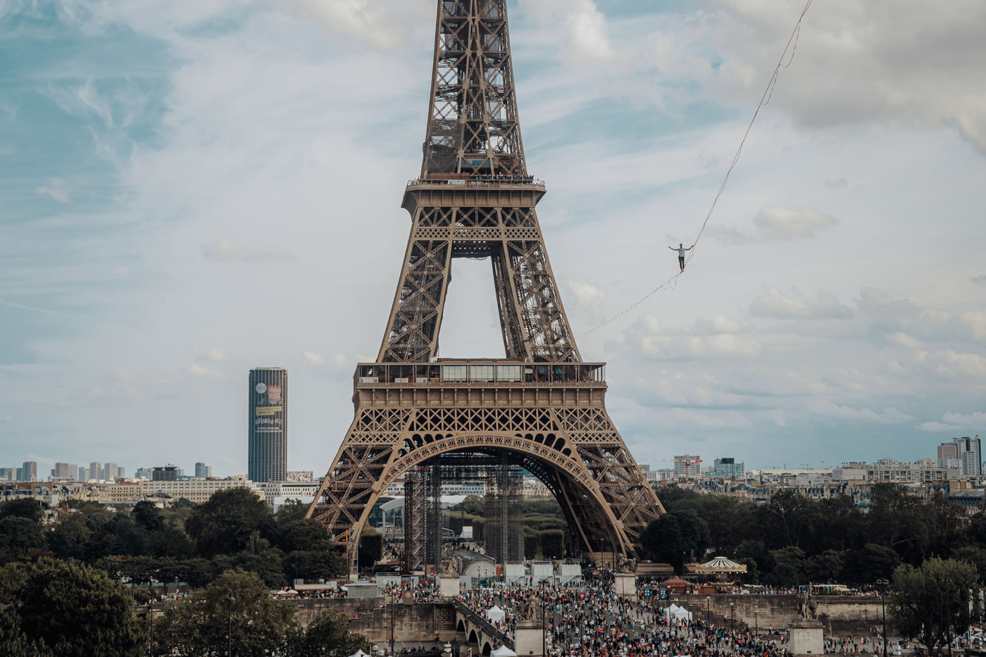Chaillot experience the tightrope walker Nathan Paulin crosses the Seine on a wire going from the Eiffel Tower to the Trocadéro