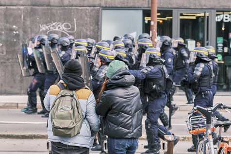 Police deployed in Nantes for the sixth day of strikes and demonstrations against pension reform on Tuesday 7 March 2023. 75,000 people (according to the work unions) marched through the streets of Nantes, 30,000 according to the prefecture.