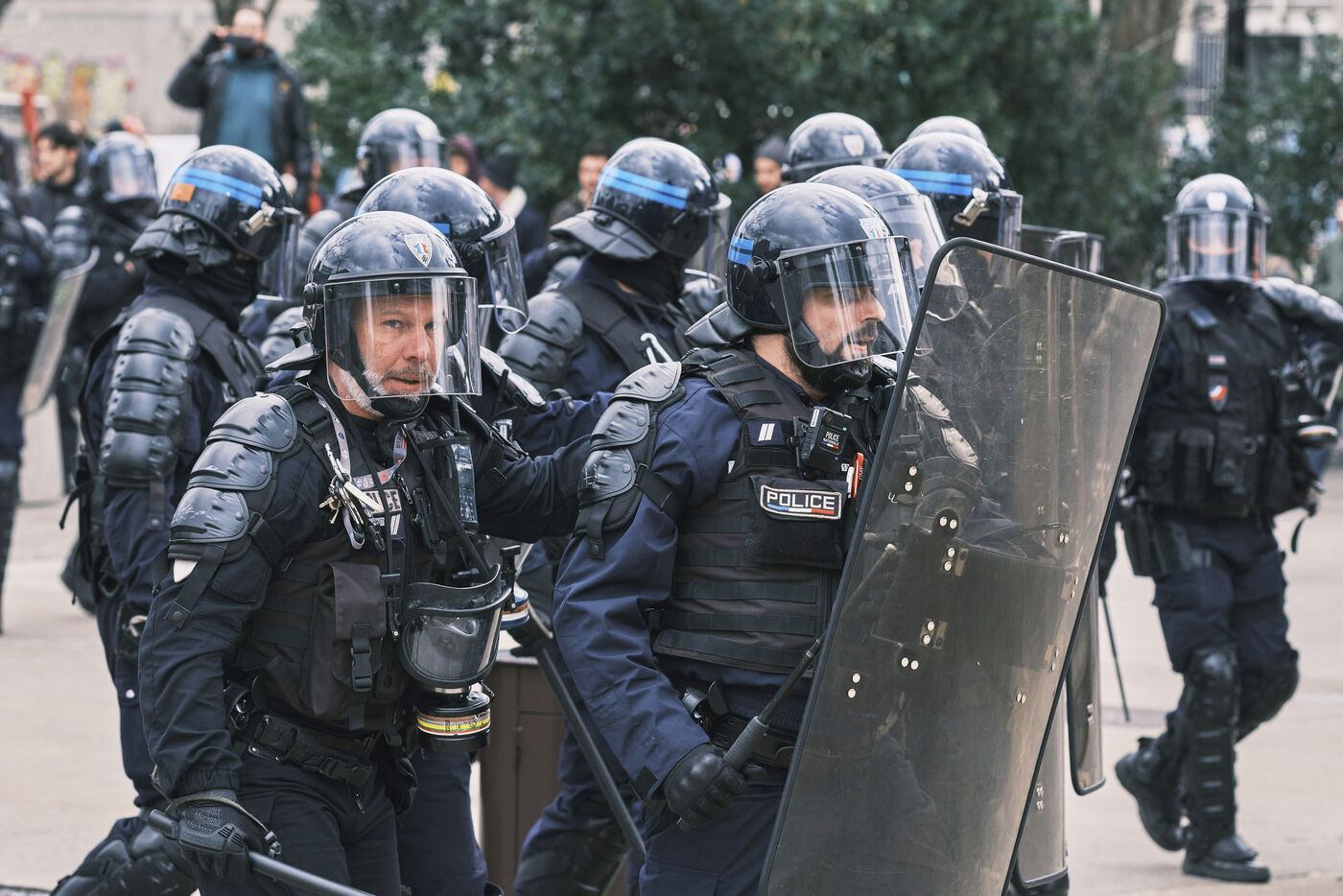 Forces de l'ordre déployés à Nantes lors de la sixième journée de grève et de manifestation contre la réforme des retraites ce Mardi 7 Mars 2023. 75 000 personnes (selon les syndicats) ont défilé dans les rues de Nantes, 30 000 selon la préfecture.