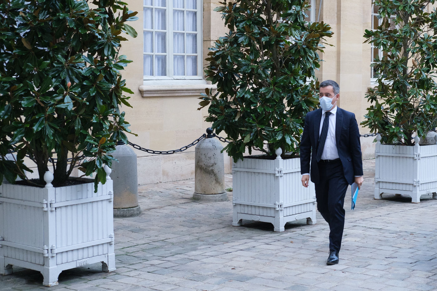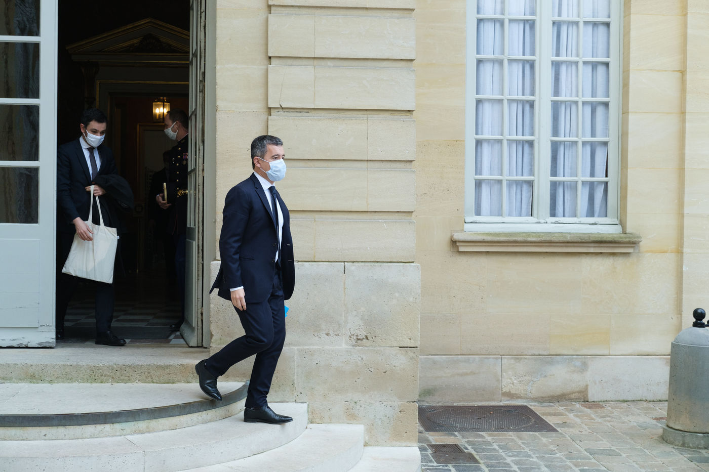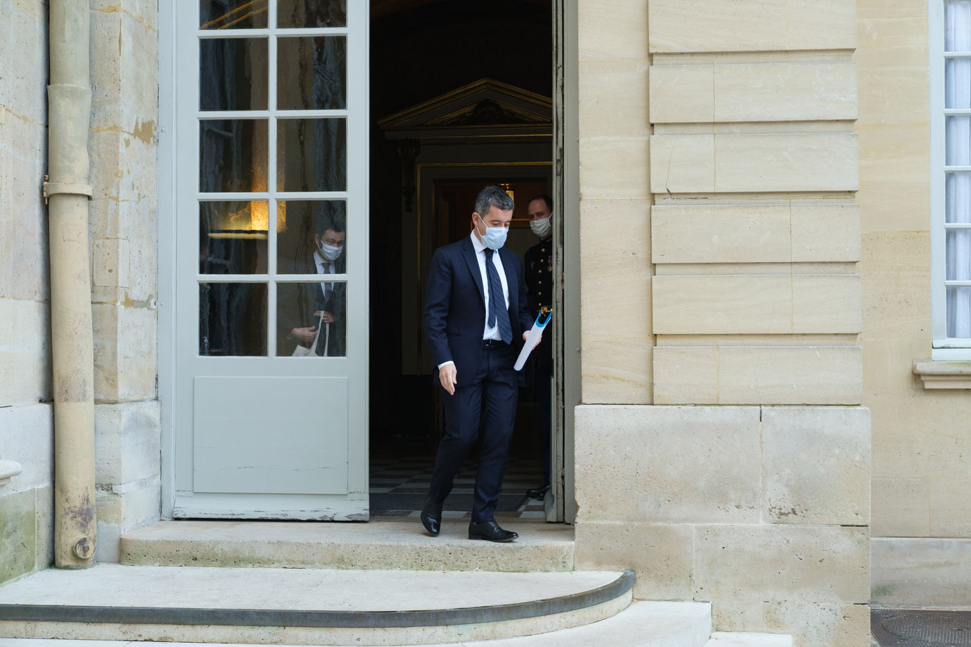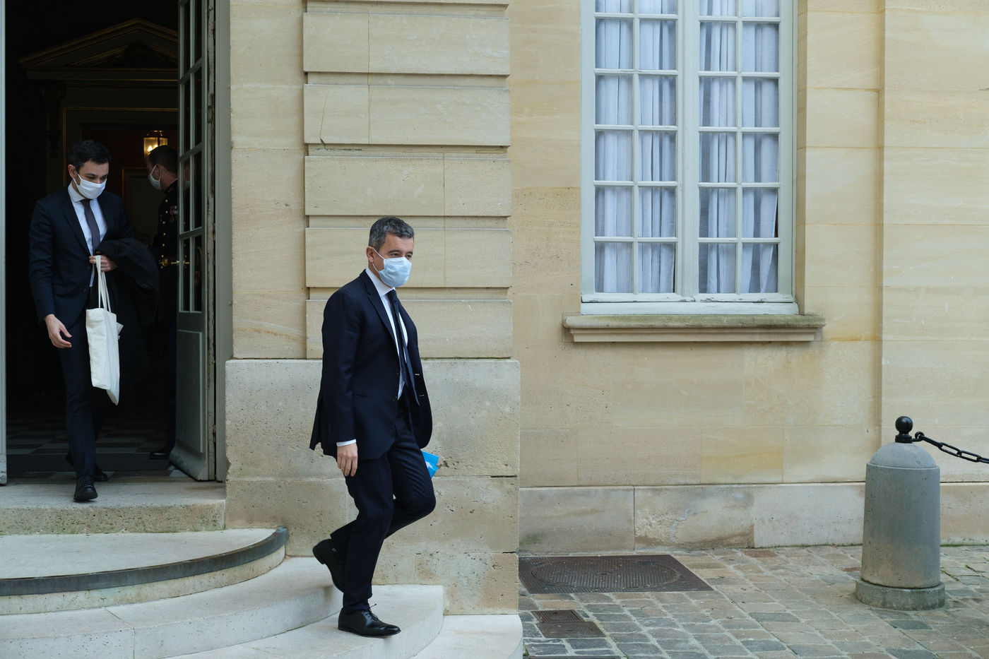 Photos of Gérald Darmanin, Minister of the Interior, and Gabriel ATTAL, Secretary of State to the Prime Minister, Government Spokesman, at the entrance and exit of the meeting.