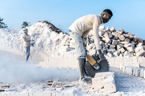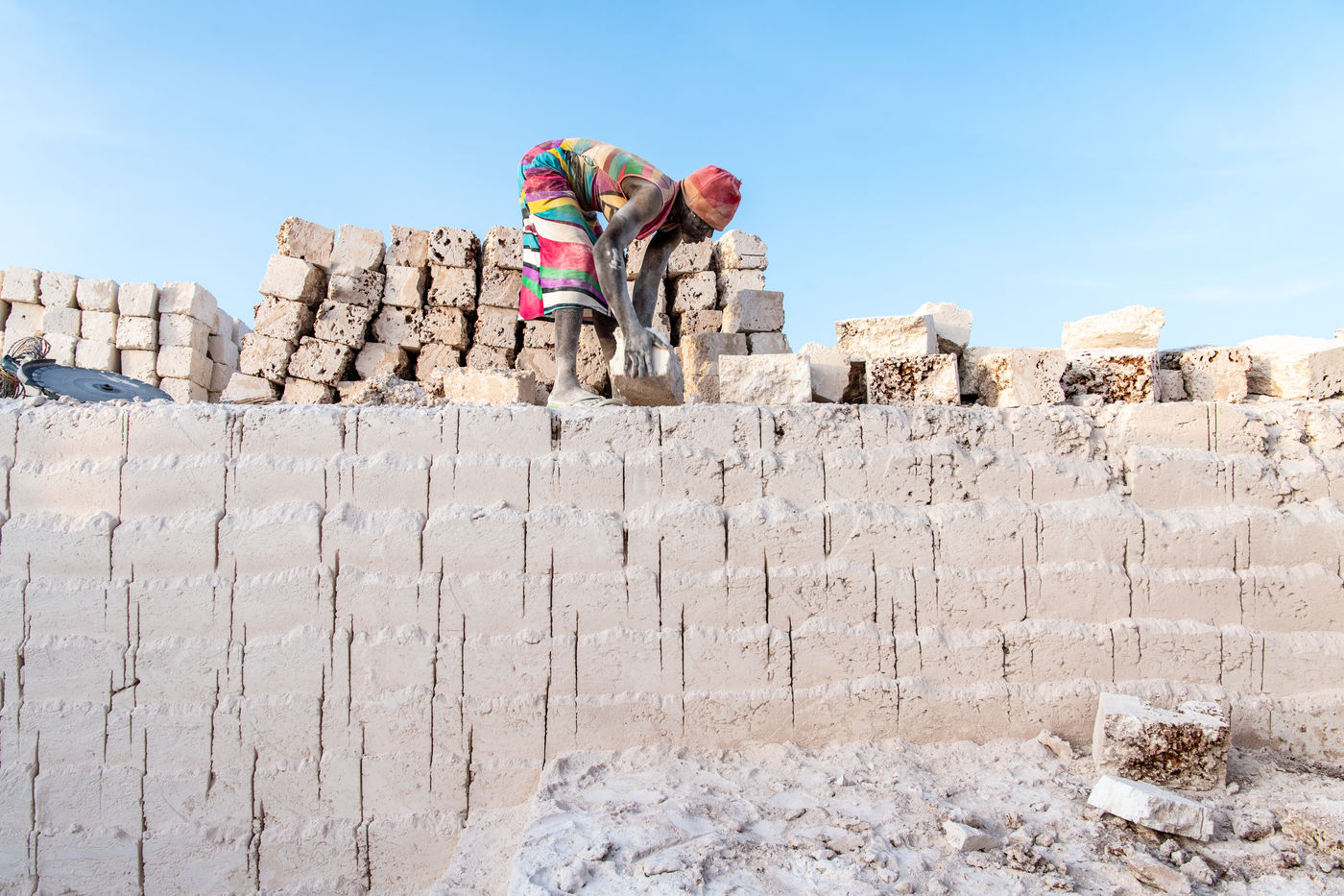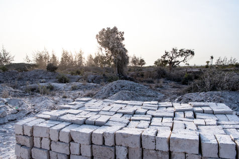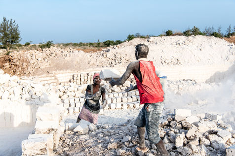 Coupées à même le sol dans une épaisse fumée blanche, les briques, faites de corail naturellement compacté, servent à la construction de toutes les habitations de la région.