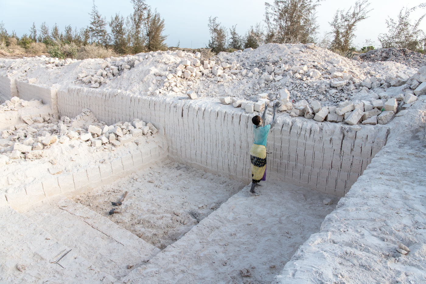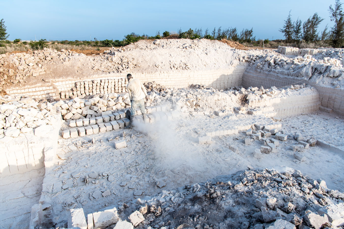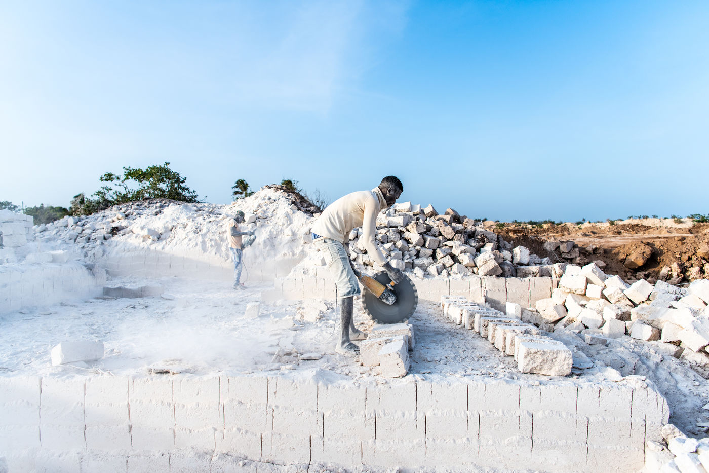 Cut from the ground in a thick white smoke, the bricks, made of naturally compacted coral, are used to build all the houses in the region.