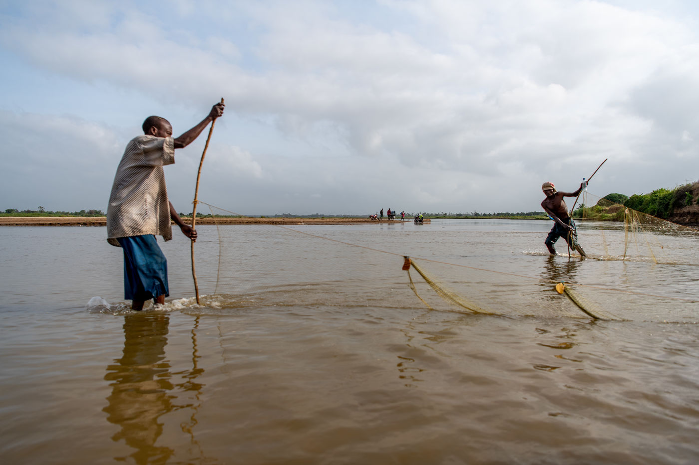 With water sometimes up to their necks, two to three people hold a net that they drag along the bank to catch passing fish.