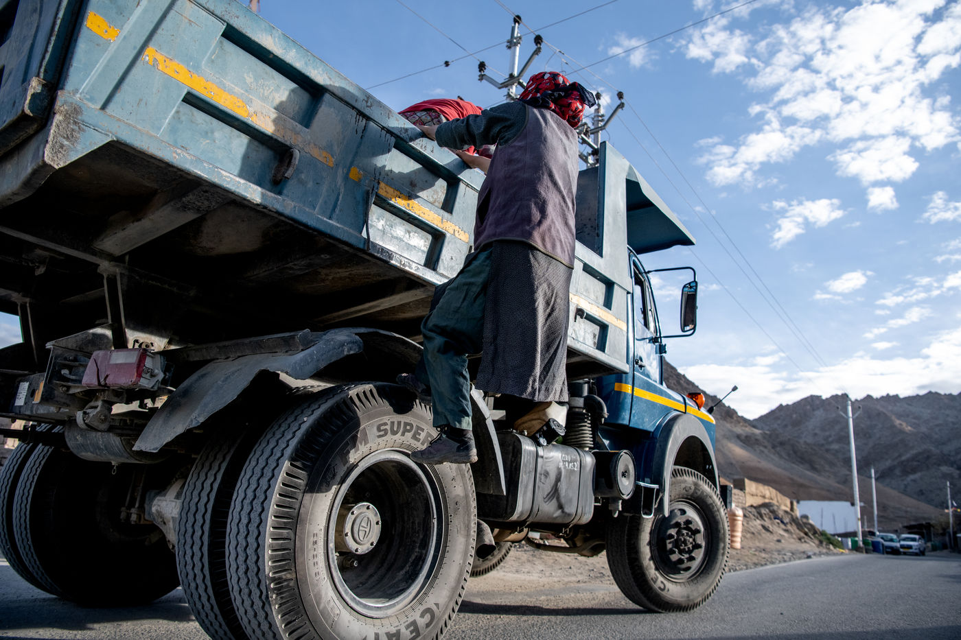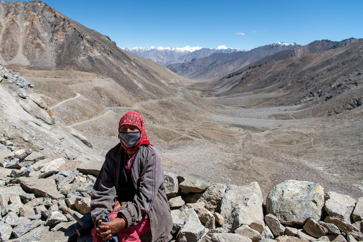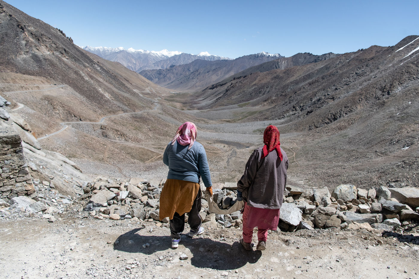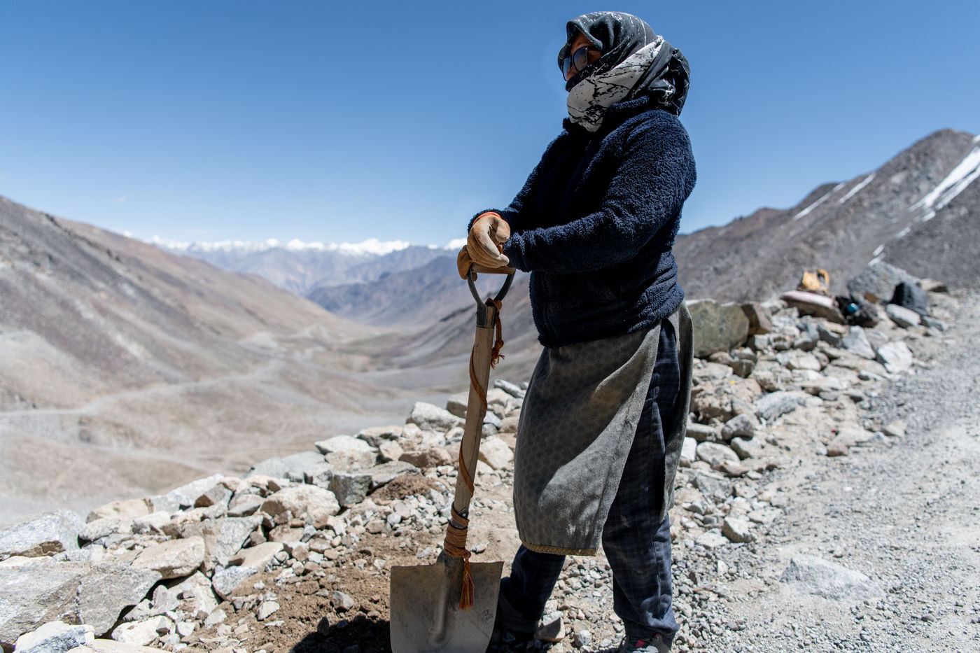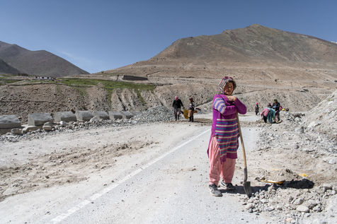 Chaque matin, un camion vient chercher les travailleurs et travailleuses de la Border Road Organisation et les dépose à des altitudes dépassant les 5500 mètres. Pelle à la main et sac en tissu pour toute brouette, hommes et femmes creusent la montagne, en dégagent la chaussée des roches tombées et rebouchent les ornières. À cette altitude où l'oxygène vient à manquer, on respire mal, chaque effort est pénible.