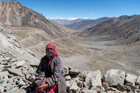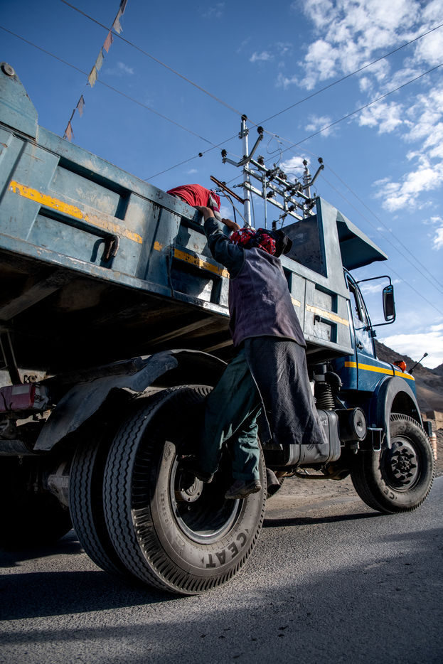 Every morning, a truck picks up the workers of the Border Road Organisation and drops them off at altitudes of over 5500 meters. With shovel in hand and a cloth bag for a wheelbarrow, men and women dig the mountain, clear the road of fallen rocks and fill in the ruts. At this altitude, where oxygen is scarce, breathing is difficult and every effort is painful.