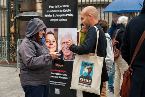 In Lyon, in the Rhône region of France, on May 7, 2025, hundreds of people gather to support two French hostages, Cécile Kohler and Jacques Paris, who have been detained in Iran for three years.