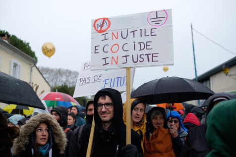 France, Saint-Germain-des-Pres, 2023-12-09. Manifestation action (Manif'Action) contre l'autoroute A69, le béton et le bitume organisé par le collectif La Voie est Libre (LVEL), Exctinction Rebellion Toulouse (XR), le Groupe National de Surveillance des Arbres (GNSA), Castres Antifasciste, Lauraguais sans bitume et Les Soulèvements de la Terre.