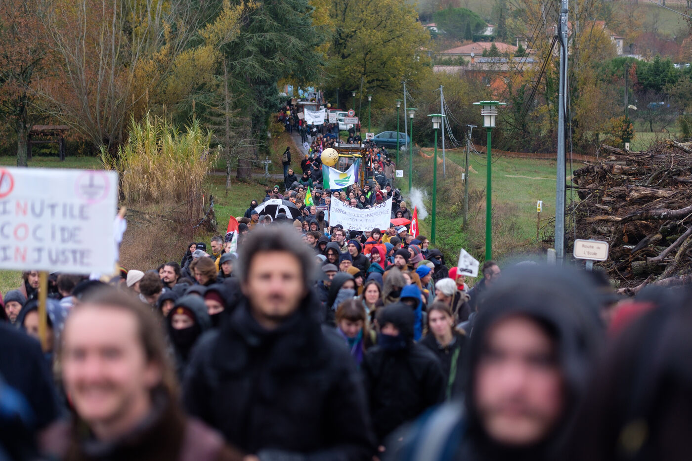 France, Saint-Germain-des-Pres, 2023-12-09. Manifestation action (Manif'Action) against the A69 freeway, concrete and bitumen organized by La Voie est Libre (LVEL), Exctinction Rebellion Toulouse (XR), Groupe National de Surveillance des Arbres (GNSA), Castres Antifasciste, Lauraguais sans bitume and Les Soulevements de la Terre.