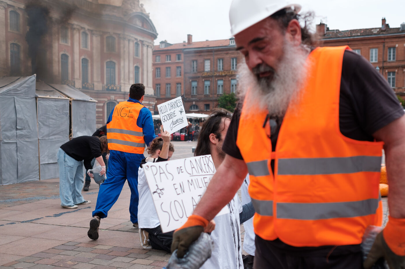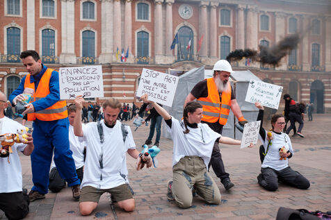 France, Toulouse, 2024-05-04. Action by the radical ecology collective Extinction Rebellion (XR) on the Place du Capitole in Toulouse to protest against the A69 freeway and the pollution generated by asphalt mixing plants.