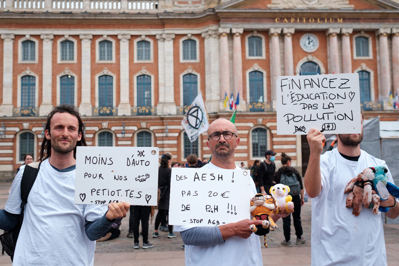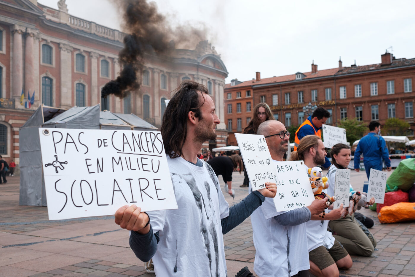 France, Toulouse, 2024-05-04. Action du collectif d'écologie radicale Extinction Rebellion (XR) sur la place du capitole à Toulouse pour protester contre l'autoroute A69 et la pollution engendrée par les centrales à enrobé.