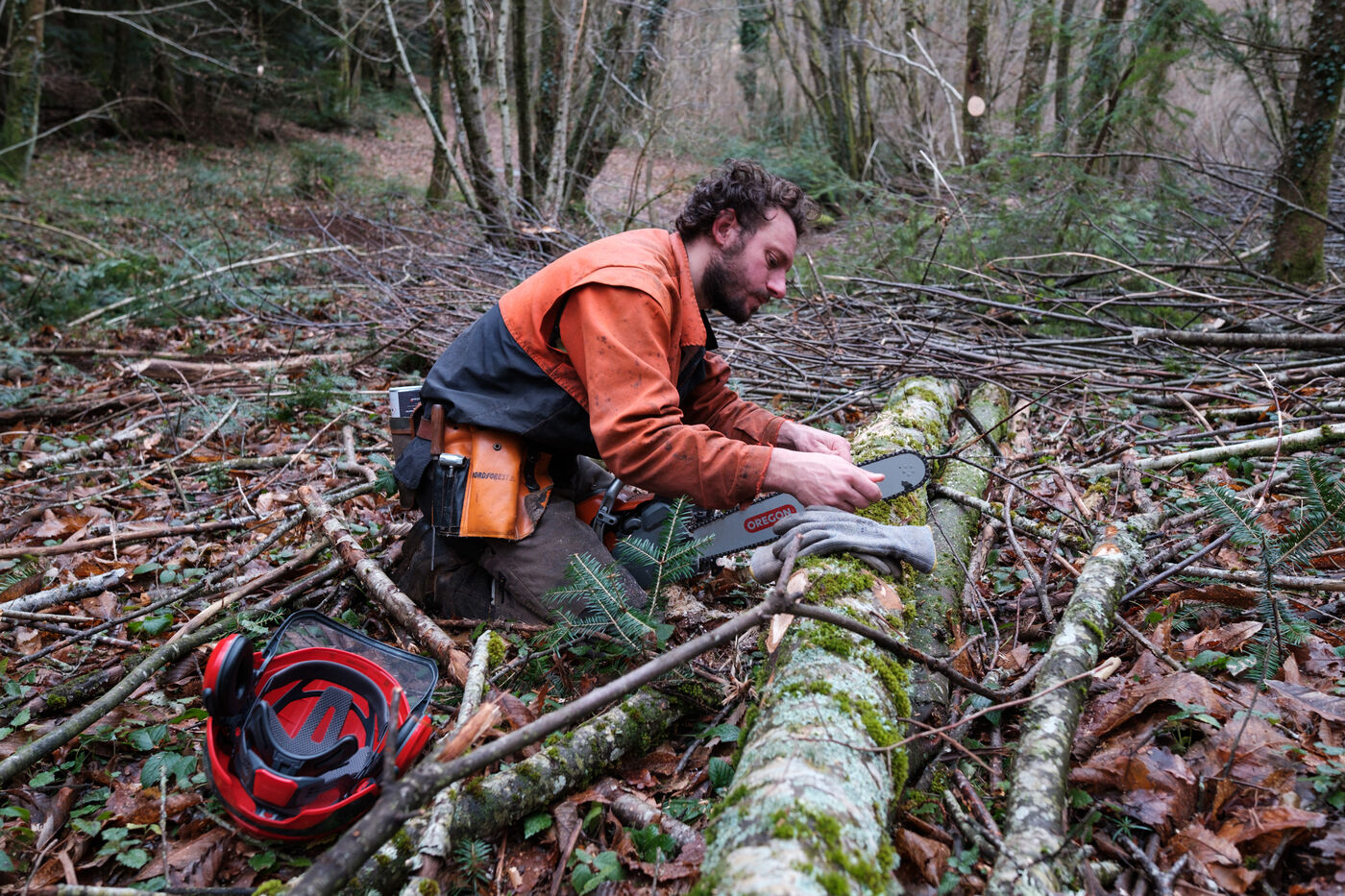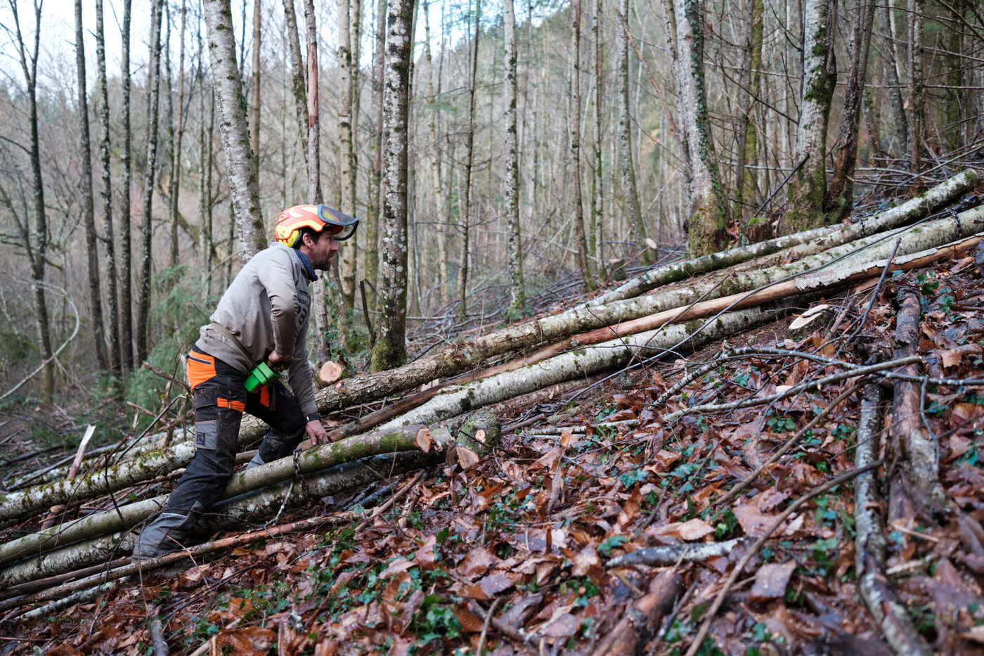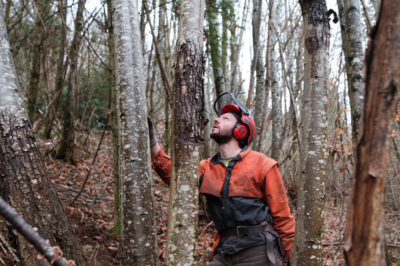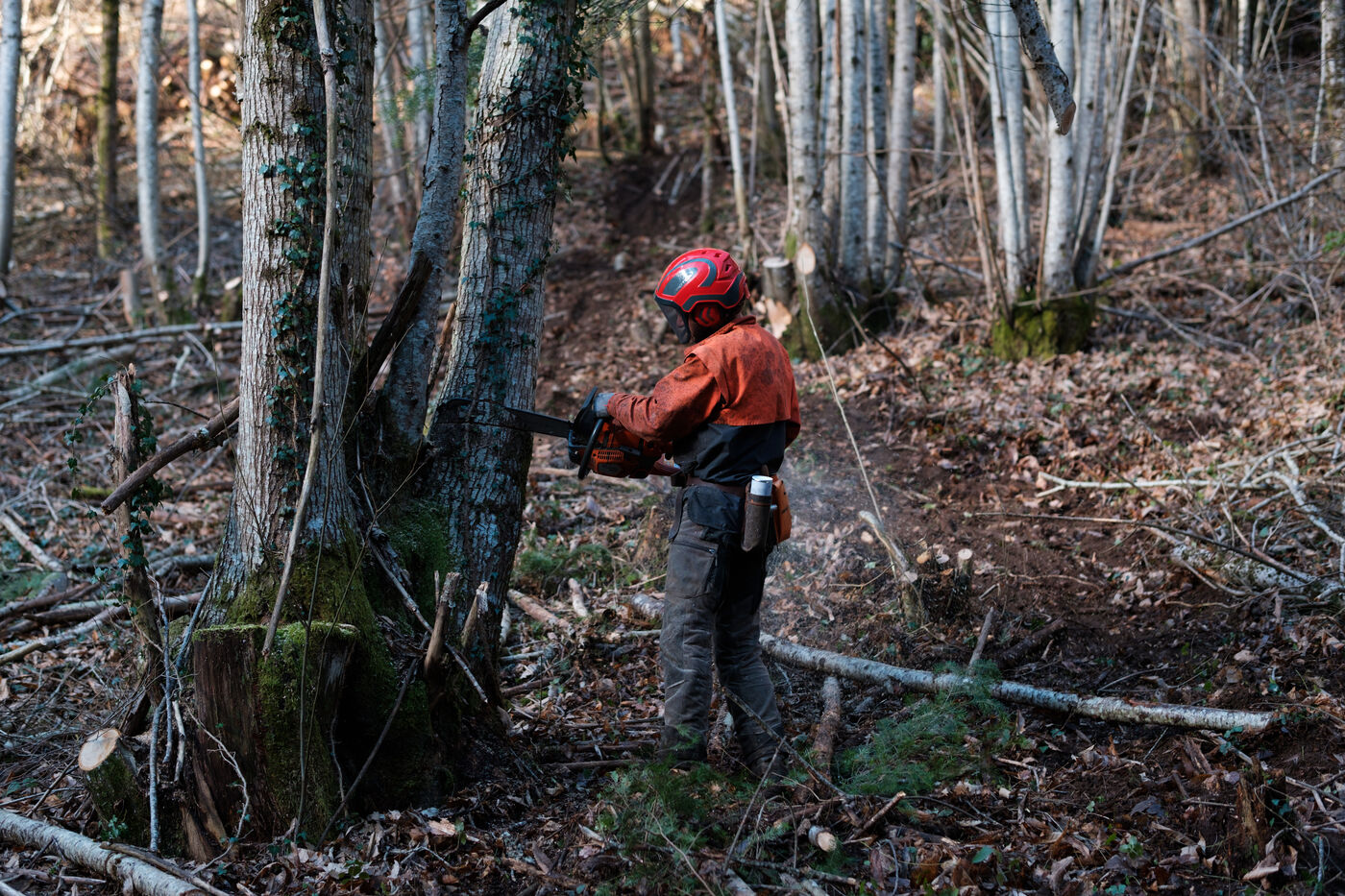 Balivage worksite on a dense coppiced chestnut stand that has not been touched since a previous clear-cut. Mathias Bonneau, a woodcutter and forest manager, is carrying out balivage to aerate the stand and lead it towards a diversified stand under irregular management with a continuous canopy, as part of a management process that is more respectful of the forest ecosystem and an alternative to industrial management.