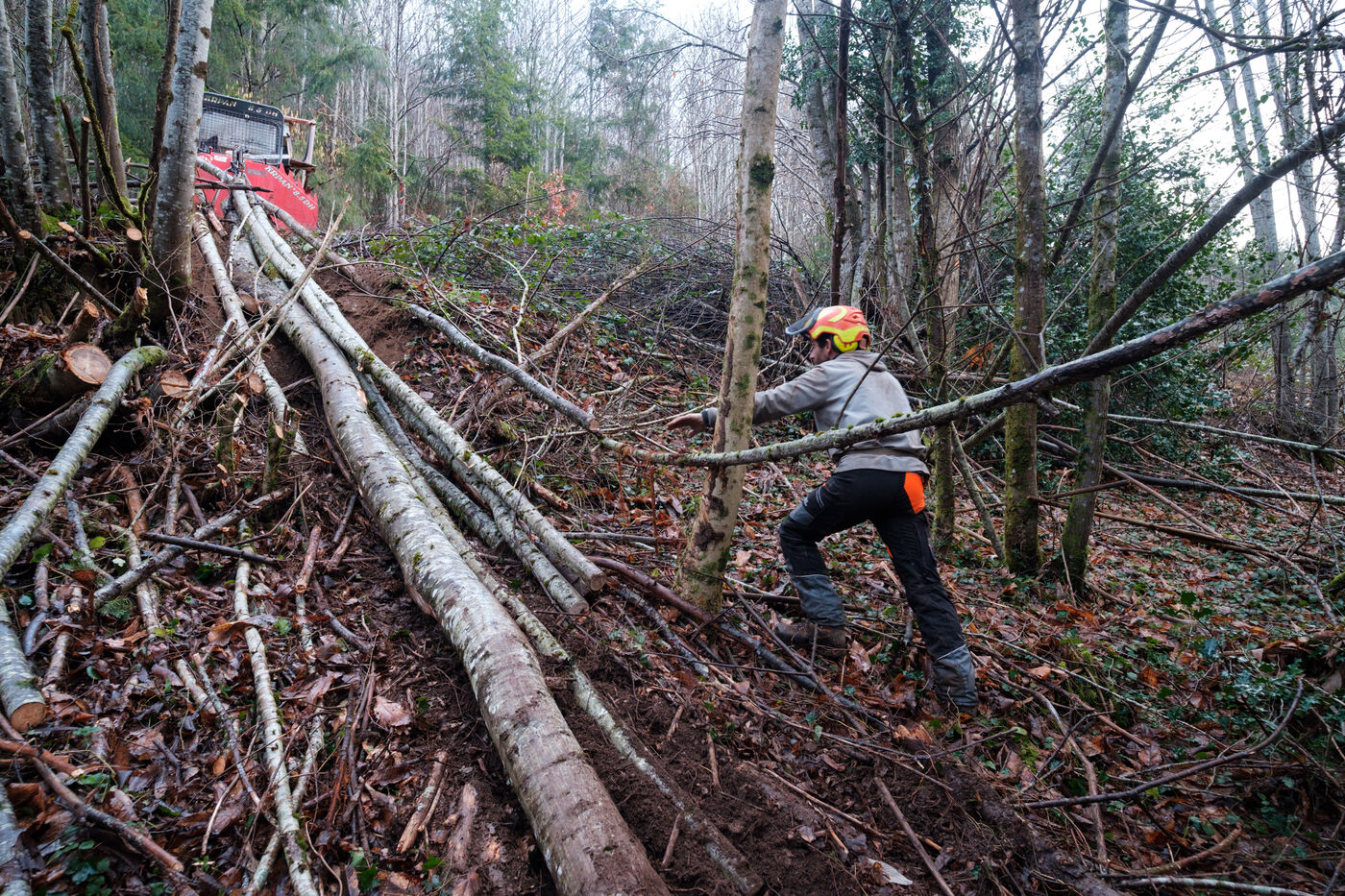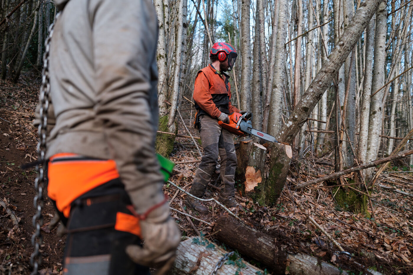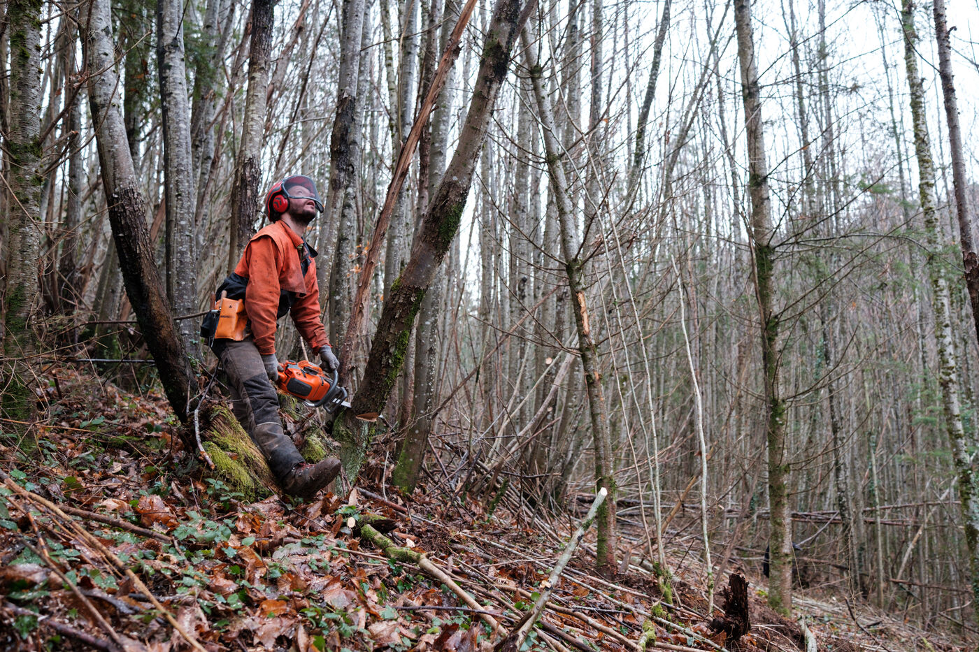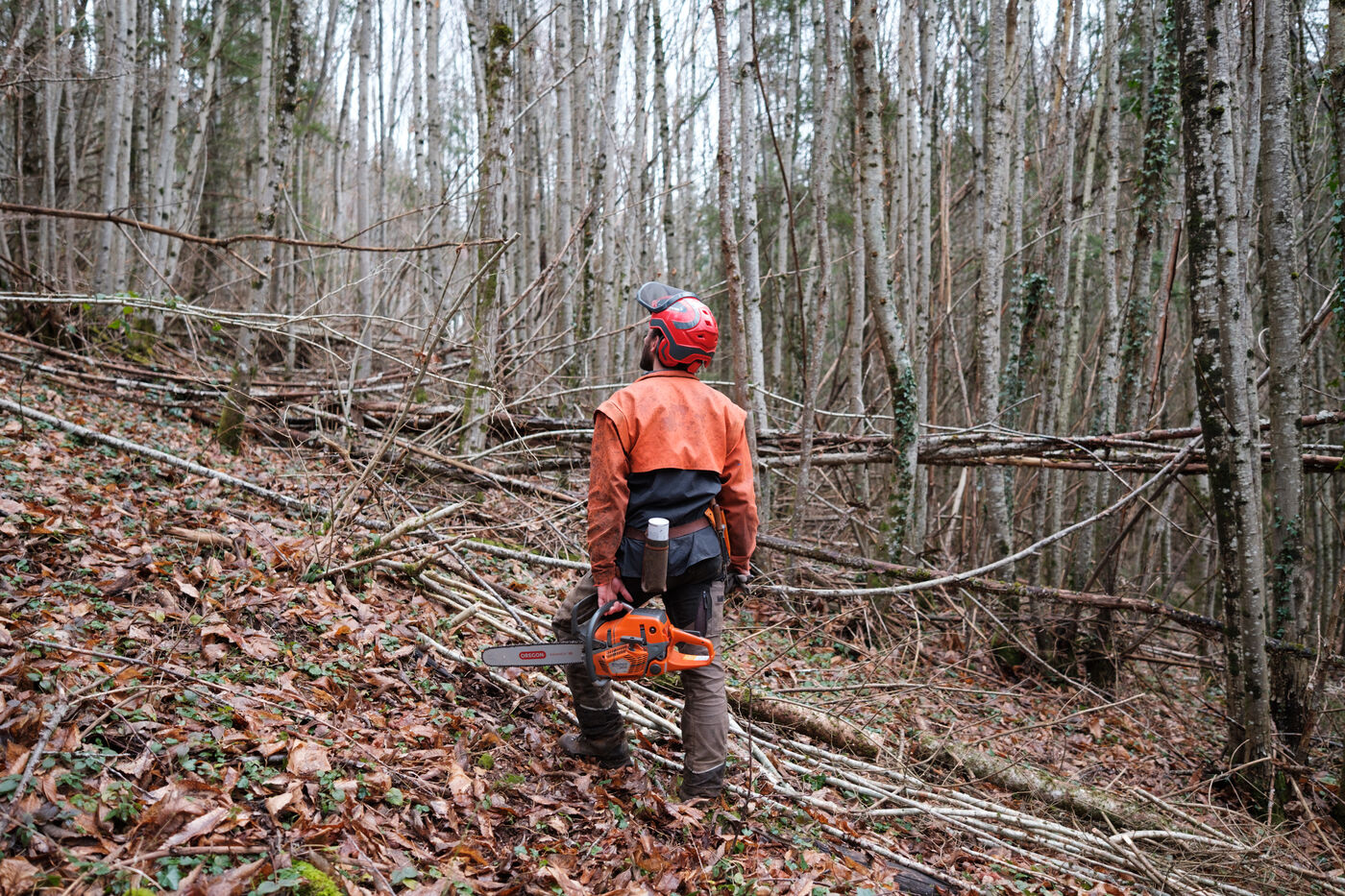 Balivage worksite on a dense coppiced chestnut stand that has not been touched since a previous clear-cut. Mathias Bonneau, a woodcutter and forest manager, is carrying out balivage to aerate the stand and lead it towards a diversified stand under irregular management with a continuous canopy, as part of a management process that is more respectful of the forest ecosystem and an alternative to industrial management.