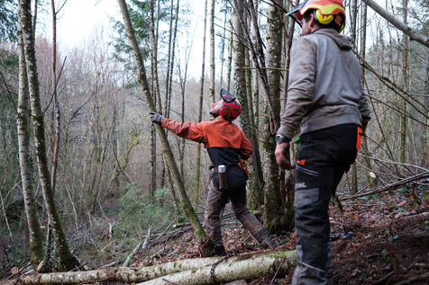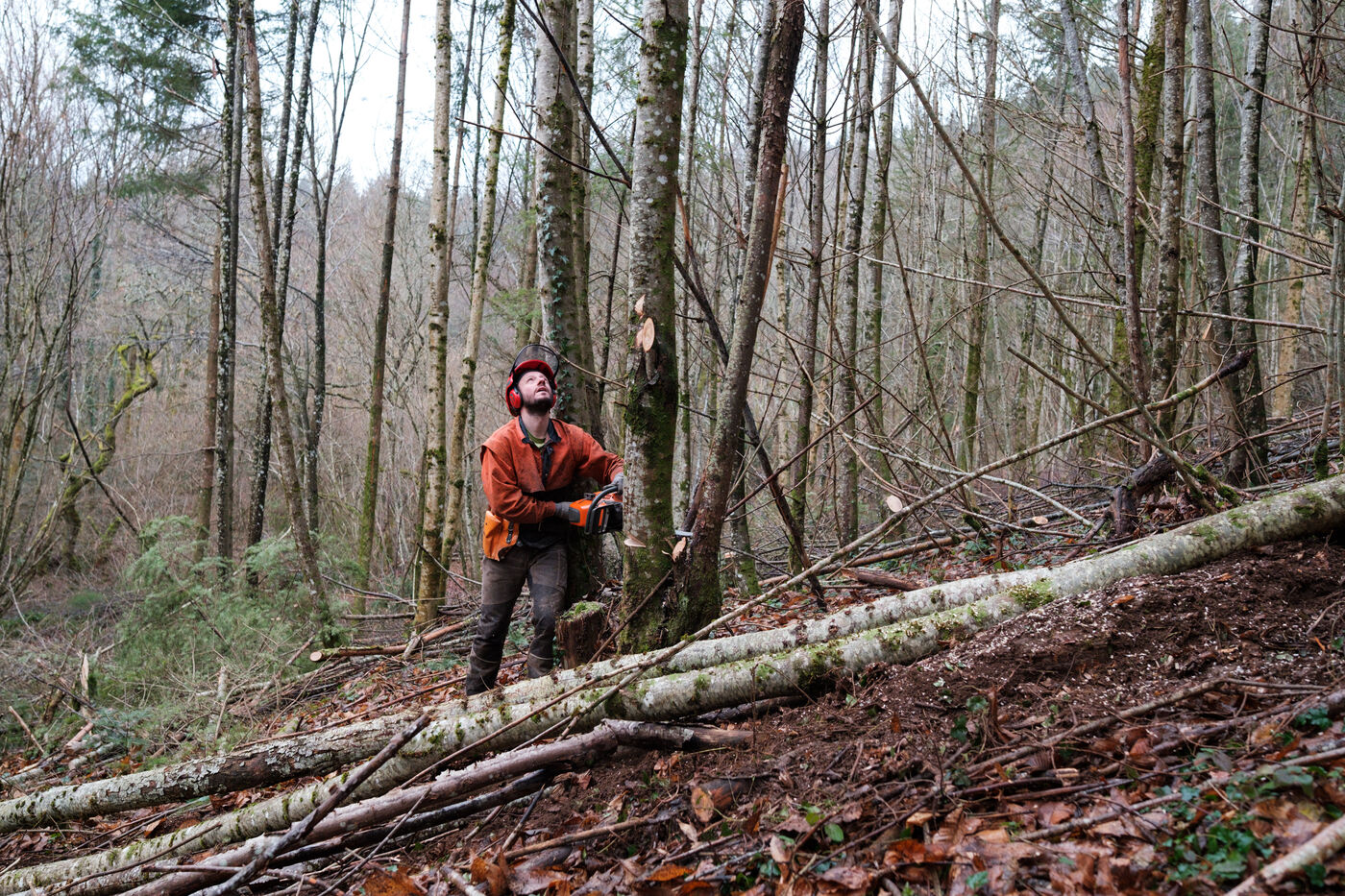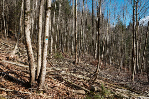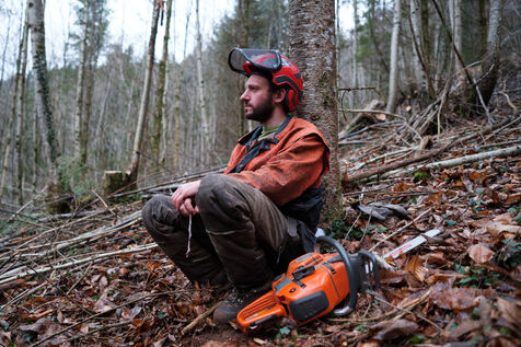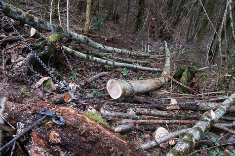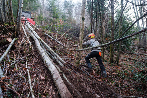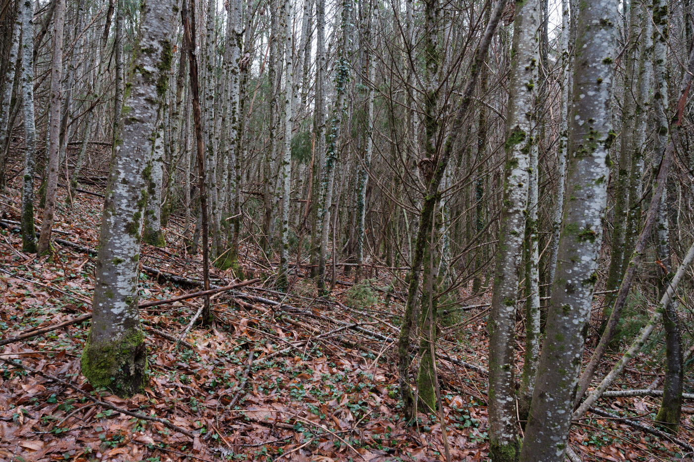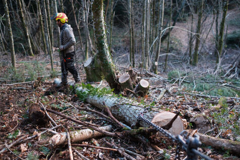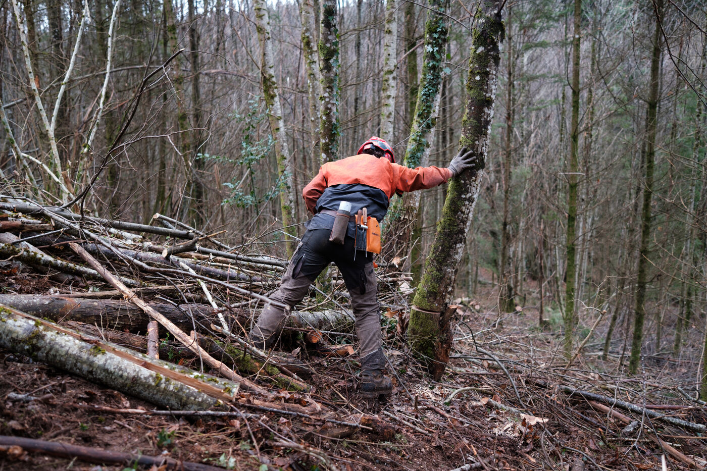 Balivage worksite on a dense coppiced chestnut stand that has not been touched since a previous clear-cut. Mathias Bonneau, a woodcutter and forest manager, is carrying out balivage to aerate the stand and lead it towards a diversified stand under irregular management with a continuous canopy, as part of a management process that is more respectful of the forest ecosystem and an alternative to industrial management.