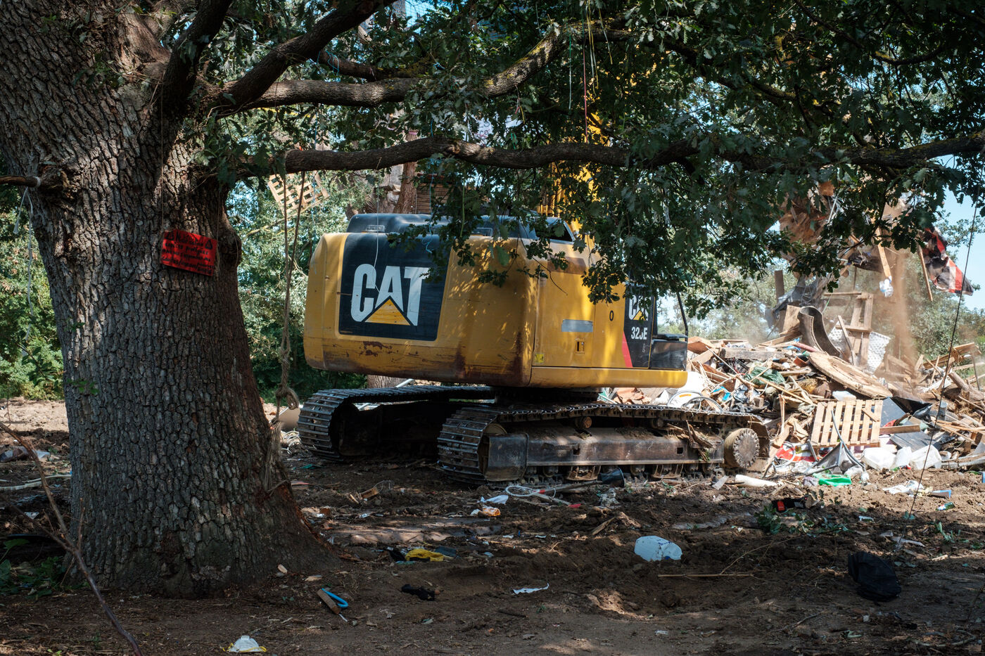 France, Saïx, 2024-08-30. Destruction du lieu d'occupation de la Cal'Arbre de la ZAD contre l'A69 où des militants et zadistes sont perchés dans des arbres pour les protéger contre l'abattage.
