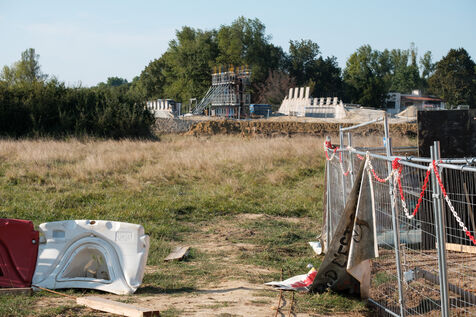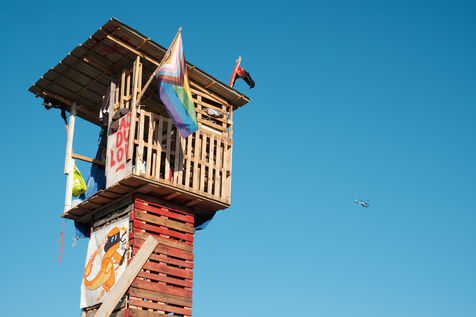 France, Saïx, 2024-28-08. Sur le site occupé de la Cal'Arbre de la ZAD contre l'A69 les militants et zadistes s'organisent suite aux fortes répressions des forces de l'ordre ces derniers jours. Ils s'organisent pour faire face à l'arrivée de la période de coupe d'arbre où les nombreux chênes occupés sont concernés par l'abattage. La forteresse Bourg-Palette fait face au chantier de construction d'un ouvrage d'art de l'autoroute.
