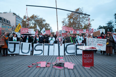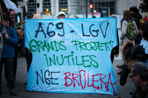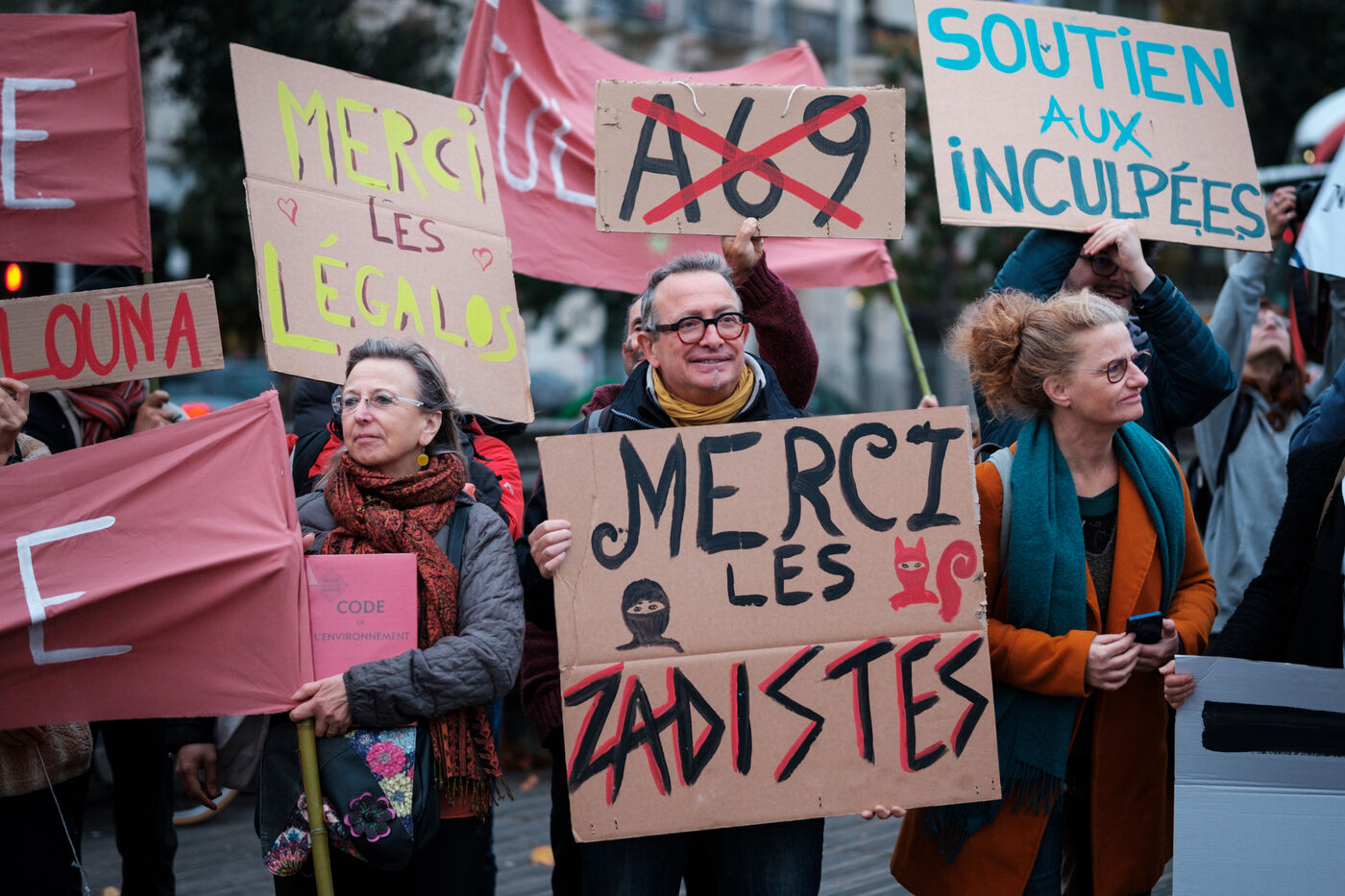 France, Toulouse, 2024-11-25. Mobilization of activists opposed to the A69 freeway between Toulouse and Castres on the day of the trial of the legitimity of this infrastructure by Atosca and the State. Ruling on the imperative reason of major public interest RIIPM.
