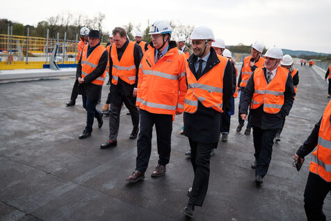 France, Castres, 2025-04-04. The Minister of Transport Philippe Tabarot visits the A69 freeway worksite at the Agout viaduct site, accompanied by elected officials and political representatives.