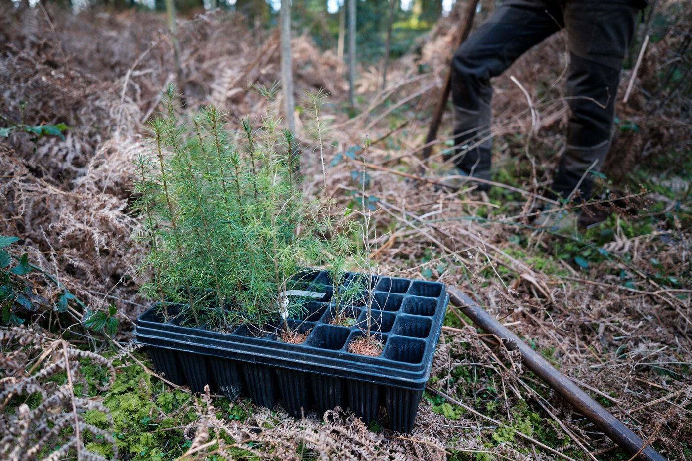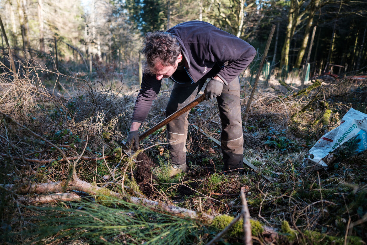 France, Tarn, 2025-03-05. Mathias Bonneau est bucheron et gestionnaire forestier. Dans sa forêt il réalise au printemps un chantier de plantation de plusieurs essences d'arbres dans des dispositifs différents pour permettre d'étudier leur évolution au sein de l'écosystème. Des expérimentations qui permettent d'observer les adaptations des individus aux évolutions écologiques et climatiques dans une forêt diversifiée à couvert continu.