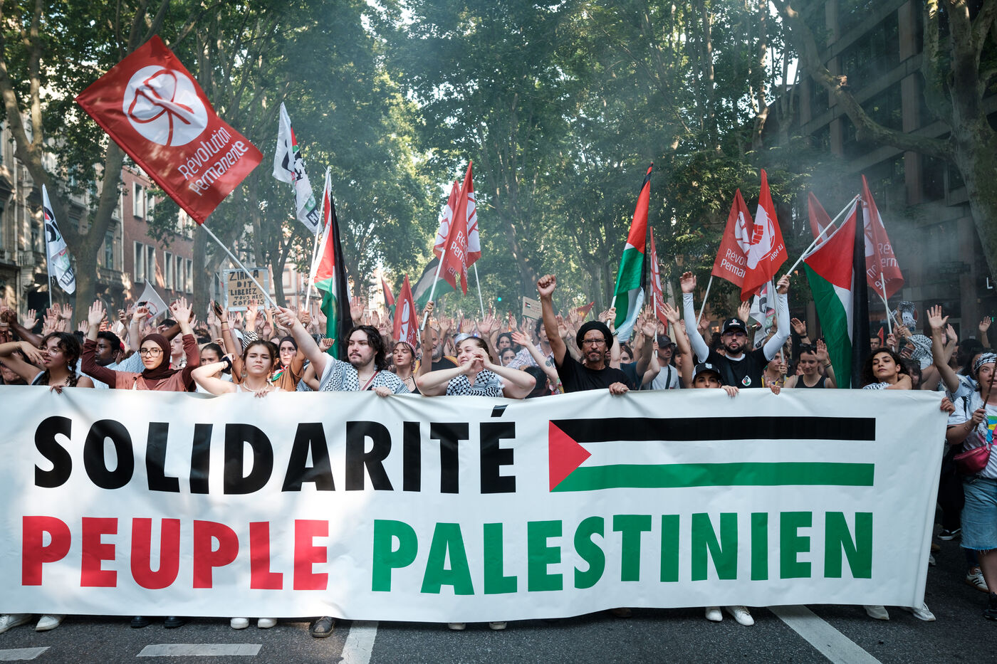 France, Toulouse, 2025-06-12. Demonstration in Toulouse to denounce the French government's inaction in the face of the ongoing genocide in Gaza and Israel's detention of the Freedom Flotilla passengers.