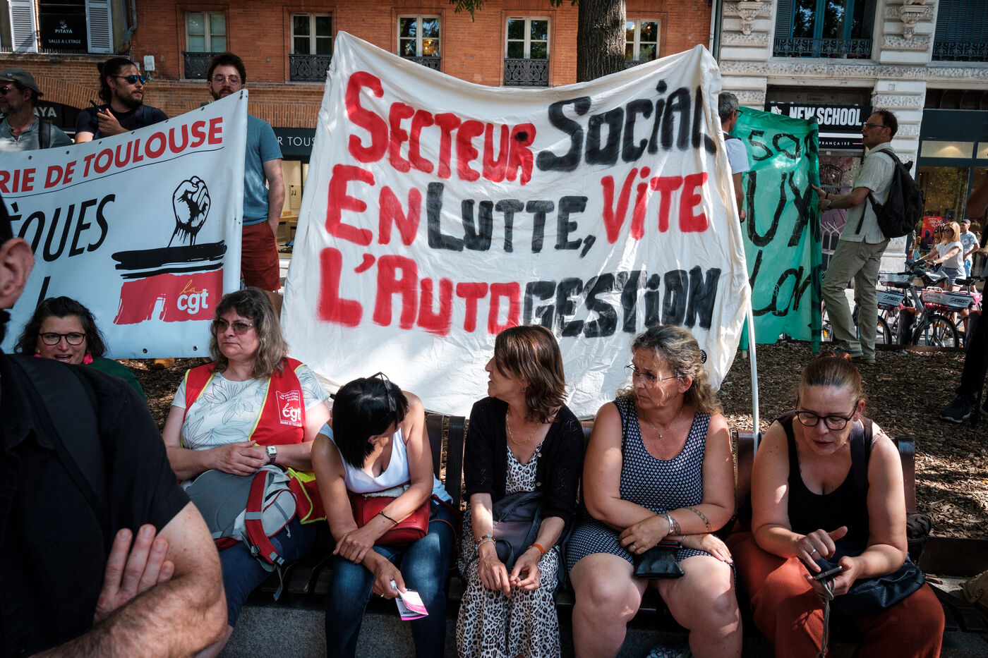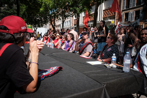 France, Toulouse, 2025-06-20. Gathering in front of the Capitole building in Toulouse, where the city council is meeting, to demonstrate against Jean-Luc Moudenc's austerity policy in the cultural and social sectors by organising a counter-council meeting.
