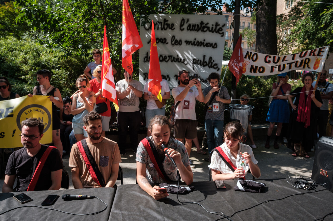 France, Toulouse, 2025-06-20. Rassemblement devant le Capitole de Toulouse, où se tient le conseil municipal, pour manifester contre la politique d'austérité de Jean-Luc Moudenc dans les milieux de la culture et du social en organisant un contre conseil municipal.