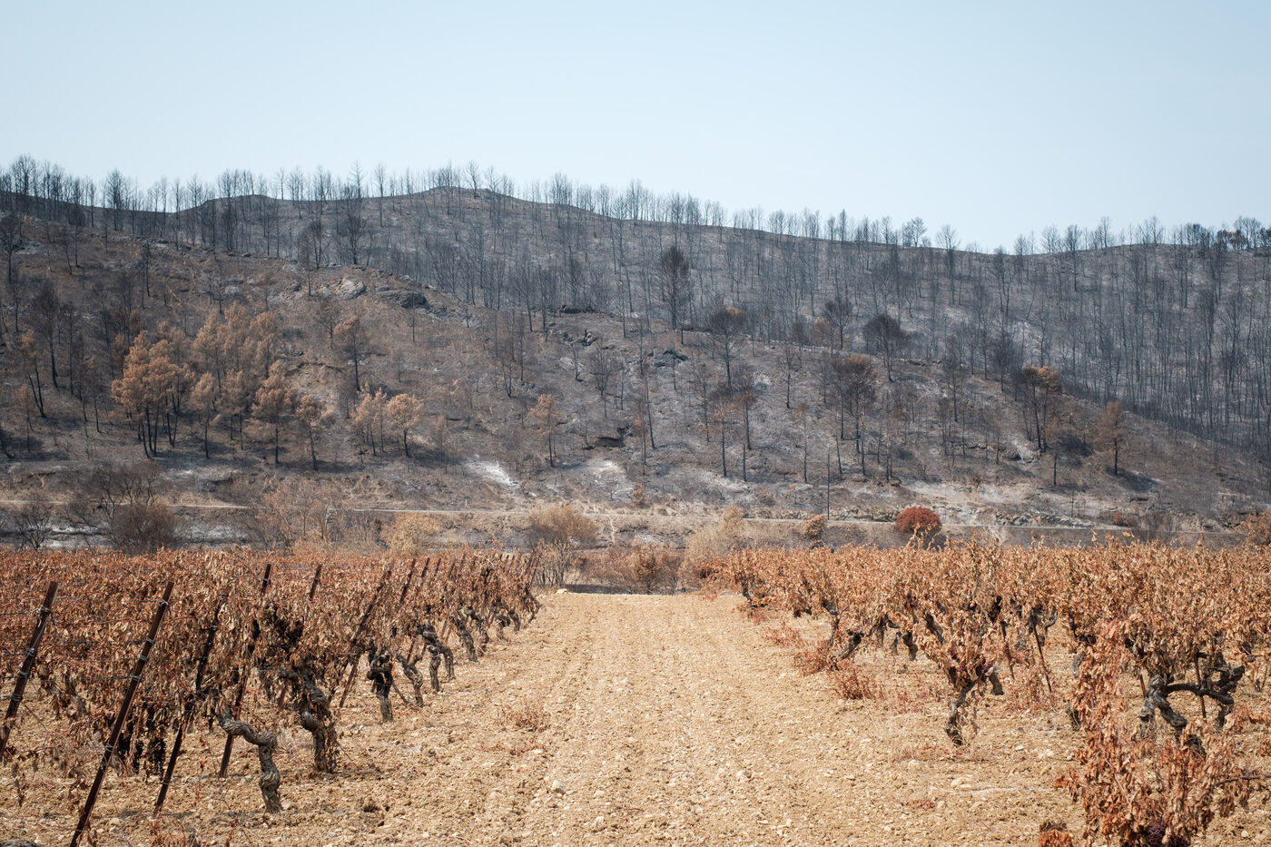 In the Corbières region, a fire of unprecedented magnitude burned nearly 17,000 hectares in the Aude department. The region, known for its vineyards, relies on agriculture as its main economic activity, but today it has been severely damaged. Winegrowers have lost everything. The vines are charred and some houses have been destroyed.