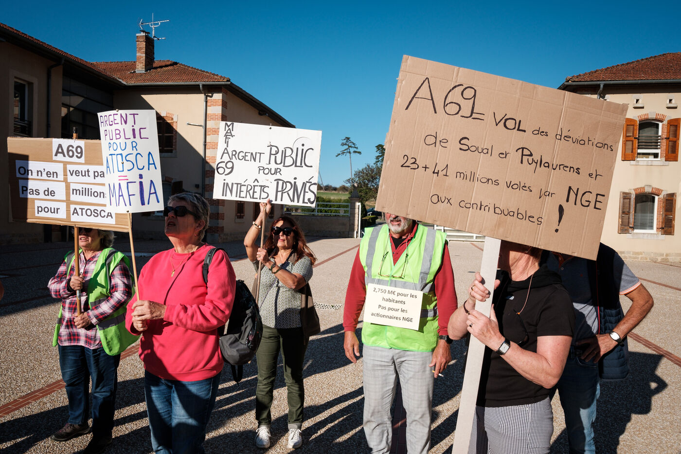 Manifestation des opposants à l'autoroute A69 lors du conseil d'agglomération Castres-Mazamet où se tient le vote pour attribuer une nouvelle subvention publique de l'agglomération au concessionnaire Atosca en contre partie d'une baisse du prix du péage, à Castres dans le département du Tarn dans le sud de la France, le 30 septembre 2025. Une subvention publique totale de 41 millions d'euros dont la communauté d'agglomération participe a hauteur de 2,750 millions d'euros.