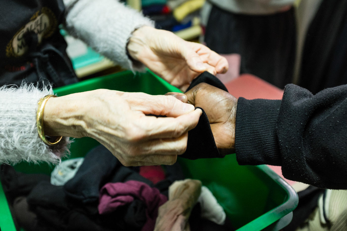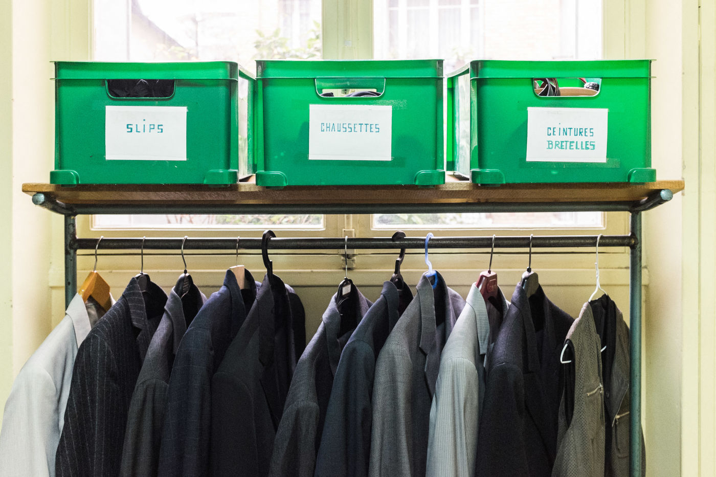 For clothing, a cloakroom is opened and run by volunteers. On Monday and Wednesday it welcomes women and children; and men on Tuesdays and Thursdays. Persons must be issued with a voucher issued by a Parisian social action center (C.A.S.) or a Paris