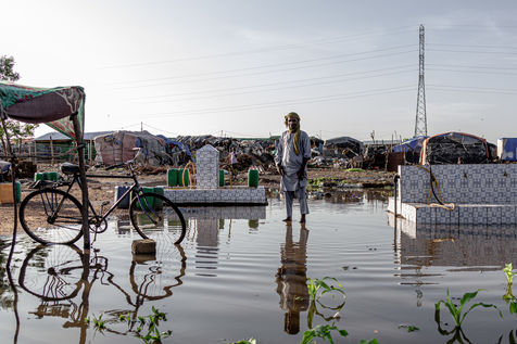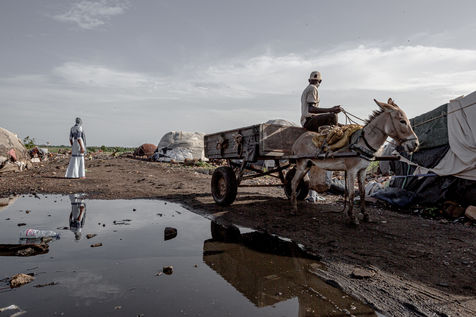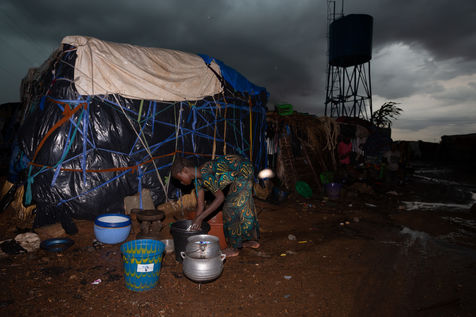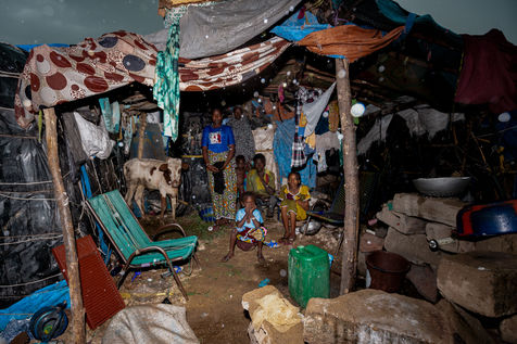 Là où se trouve les bêtes, se trouve également les hommes. C'est derrière le marché à bétail que s'élève le camp de déplacés de Faladié, un des plus grands de la capitale du Mali : Bamako. Détruit il y a plus d'un an par un incendie meurtrier, les cases de fortune ont depuis repoussé telle la végétation qui repousse sur une coulée de lave. Peuls, Dogons, Burkinabés, chassés par les exactions du centre, continuent d'affluer alors que la situation sécuritaire du pays s'envenime toujours plus. La cendre, quant à elle, fait place à la boue. Les déchets pourrissent dans les allées inondées par les fortes pluies de l'hivernage, dégageant une odeur nauséabonde qui atteste à elle seule de l'insalubrité du camp.