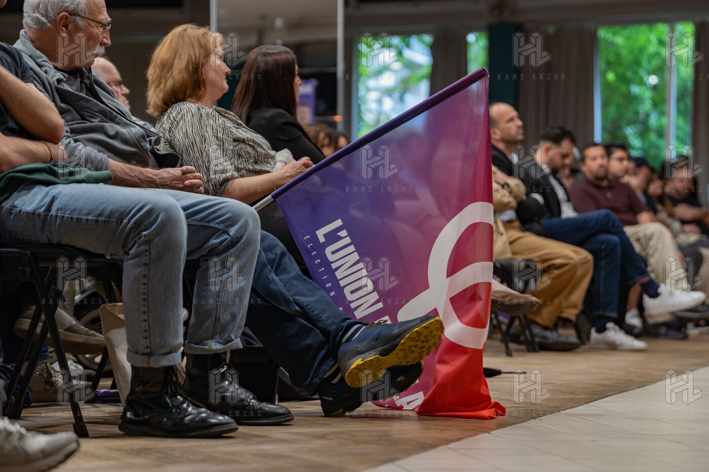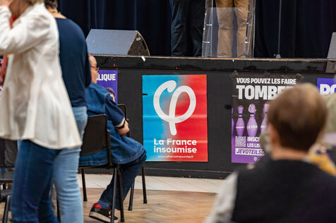 Whether in a meeting hall or pasted across city walls, the visuals of La France insoumise carry the colors and messages of a movement grounded in resistance.