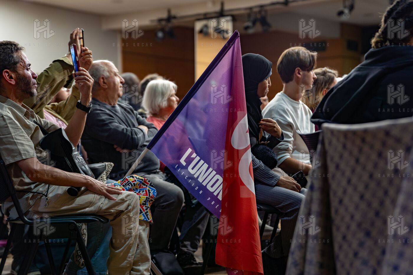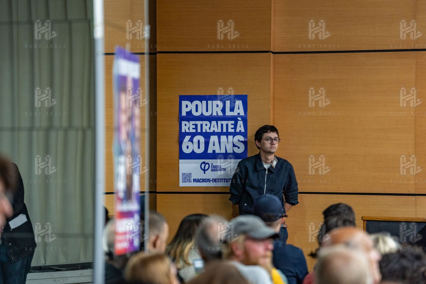 Qu’il s’agisse d’une salle de réunion ou d’un espace de collage urbain, les visuels de La France insoumise portent les couleurs et les messages d’un mouvement qui affirme ses combats.