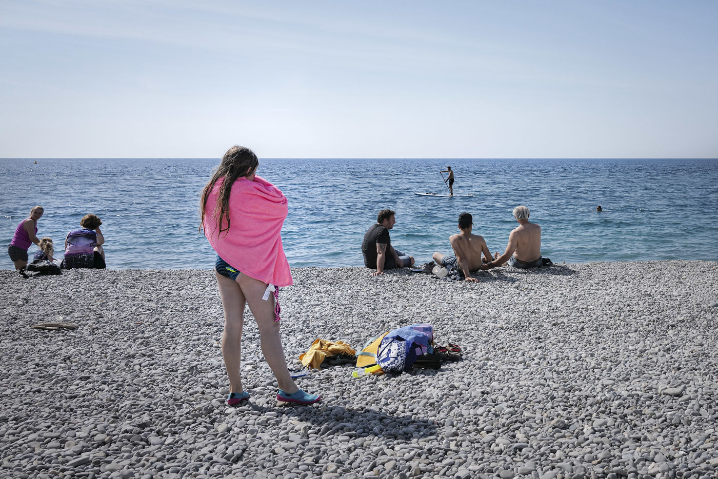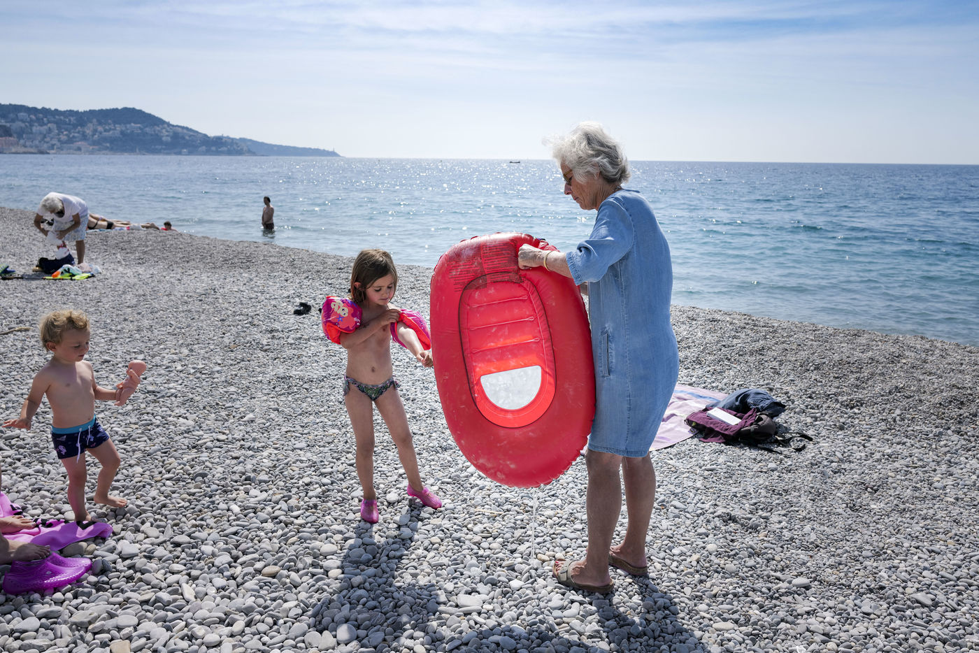 Les familles s'installent pour plusieurs heures avec leur enfants, etendent leur serviettes, sortent les bouées et les jeux de plages.