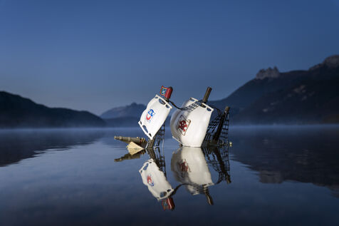 This series is the first of a trilogy entitled Falling - Bouncing. It was realized following a process that combines protocol and intuition. First, the frantic search for second-hand toys, until I filled many boxes with them, then, the search for virgin spaces symbolizing the calm power of nature: the lakes.