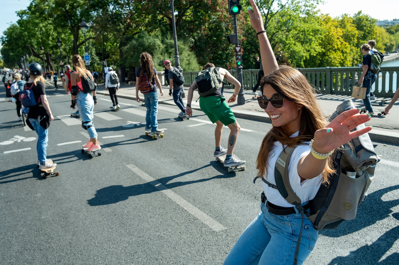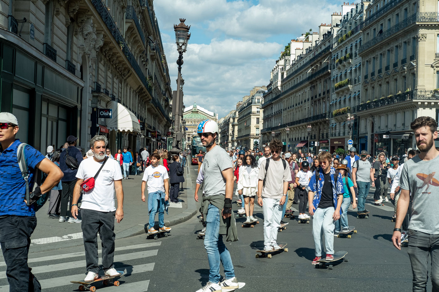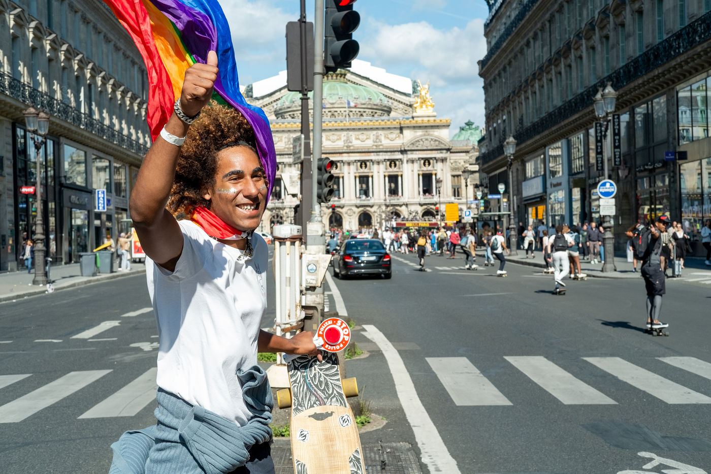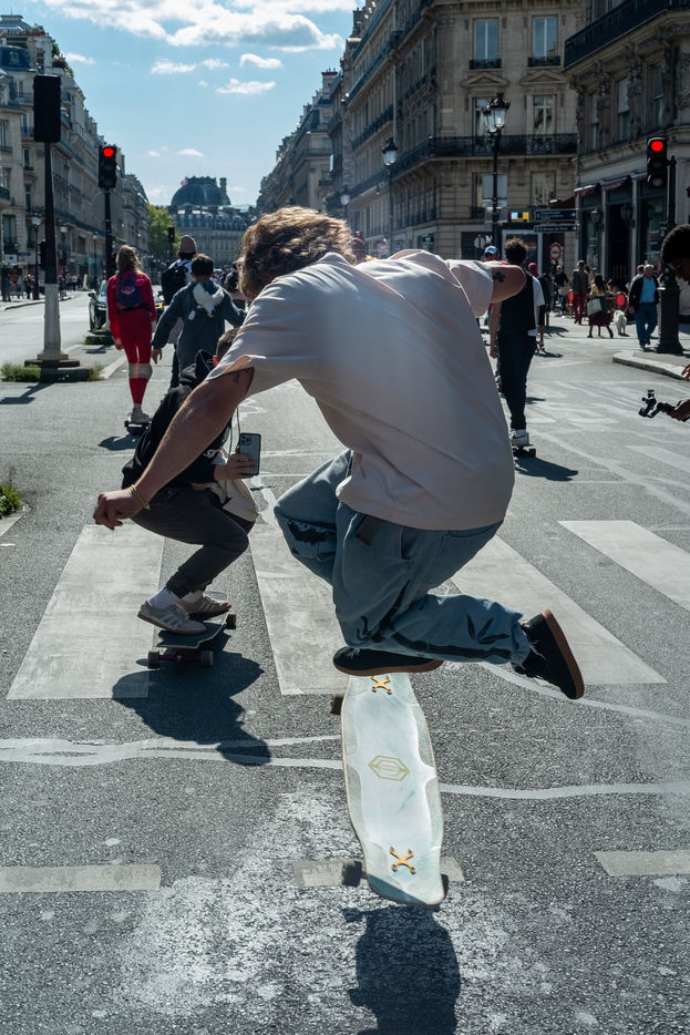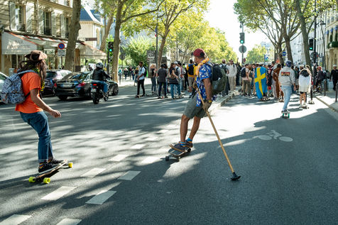 Longboard tour in the city of Paris organized by the association DockSession at the initiative of the professional skater and influencer Lotfi Lamaali. A thousand of participants gather disguised and equiped with their board to cruise through the capital during a special car free day.