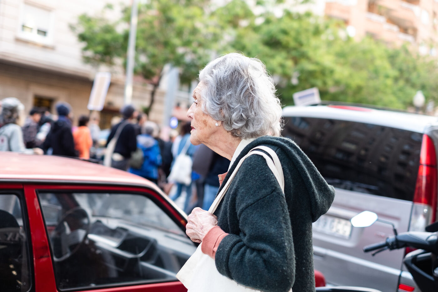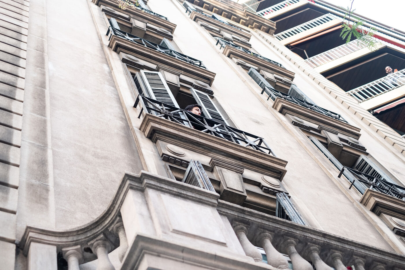 Espagne, Barcelone, 2023/05/11. Deux manifestations ont lieu dans le quartier huppé de la Bonanova à Barcelone, l?une pour soutenir les ?okupas? et l'autre pour condamner les squatters. Plusieurs centaines d'anarchistes et de black-blocks se sont retrouvés à l'occasion sous le regard critique ou complaisant des habitants du quartier. Un manifestant prend une photo.