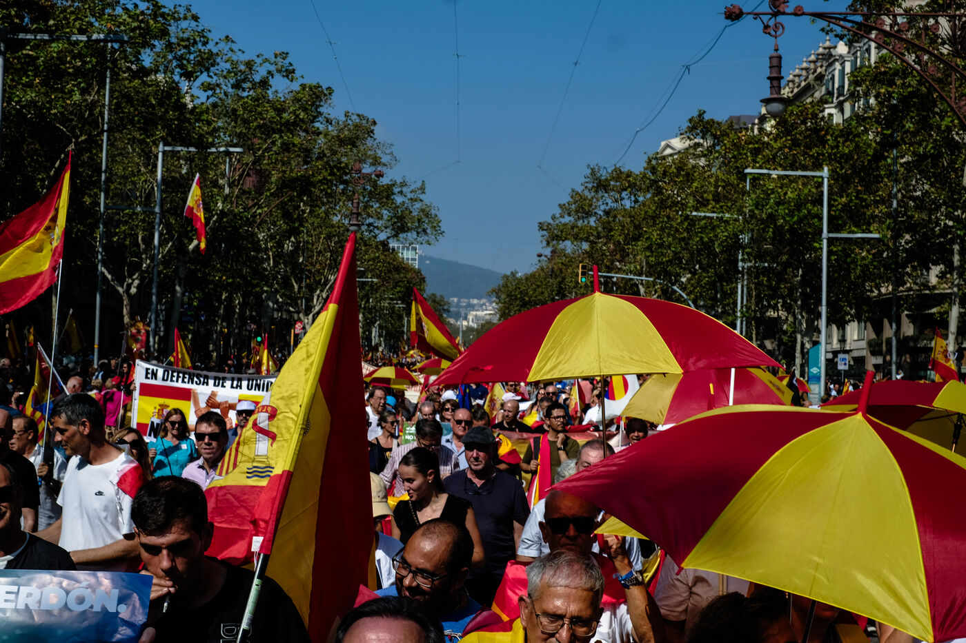 Spain, Barcelona, 2023/10/08. Demonstration in Barcelona organised by the "Catalan Civil Society" (Sociedad Civil Catalana, SCC) against the amnesty for the pro-independence leader Carles Puigdemont. The protesters gathered under the slogan "Not in my name, no amnesty, no self-determination."