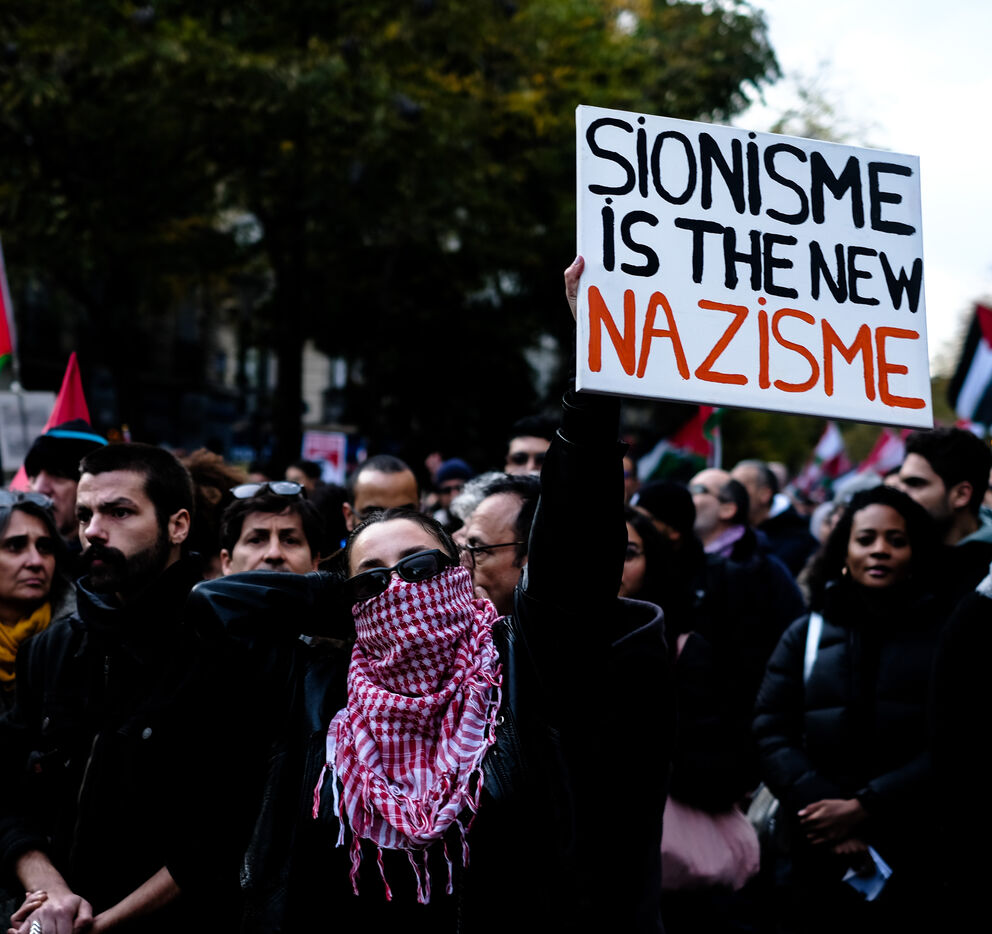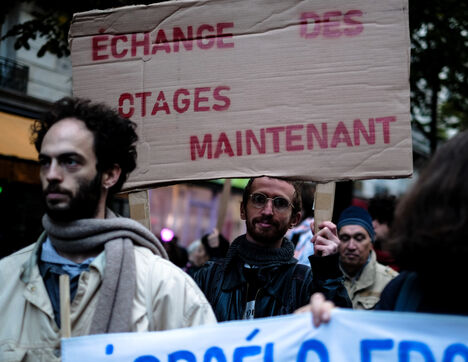 France, Paris, 23/11/11. Rassemblement à Paris convoqué par La France Insoumise (LFI) et de la NUPES en soutien à la Palestine et pour dénoncer les massacres commis par Israel. Photographie par Alexandre Bré / Hans Lucas.