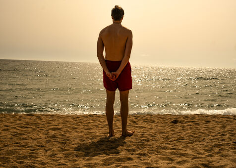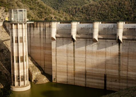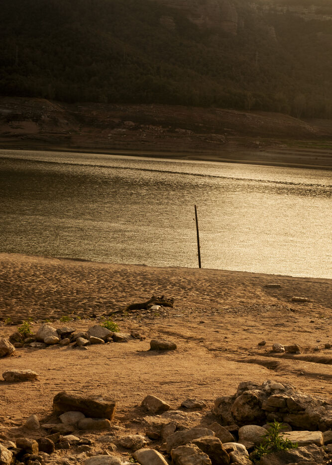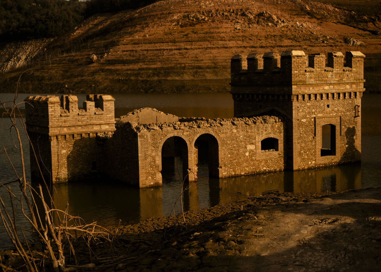 Espagne, Barcelone, 2024/03/21. Sécheresse record en Catalogne. Le barrage de Sau est presque vide, des restes d'un vieux village apparaissent. Photographie par Alexandre Bre / Hans Lucas.