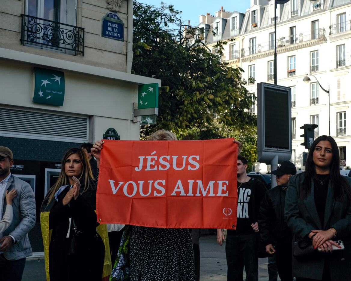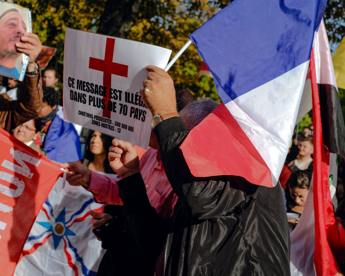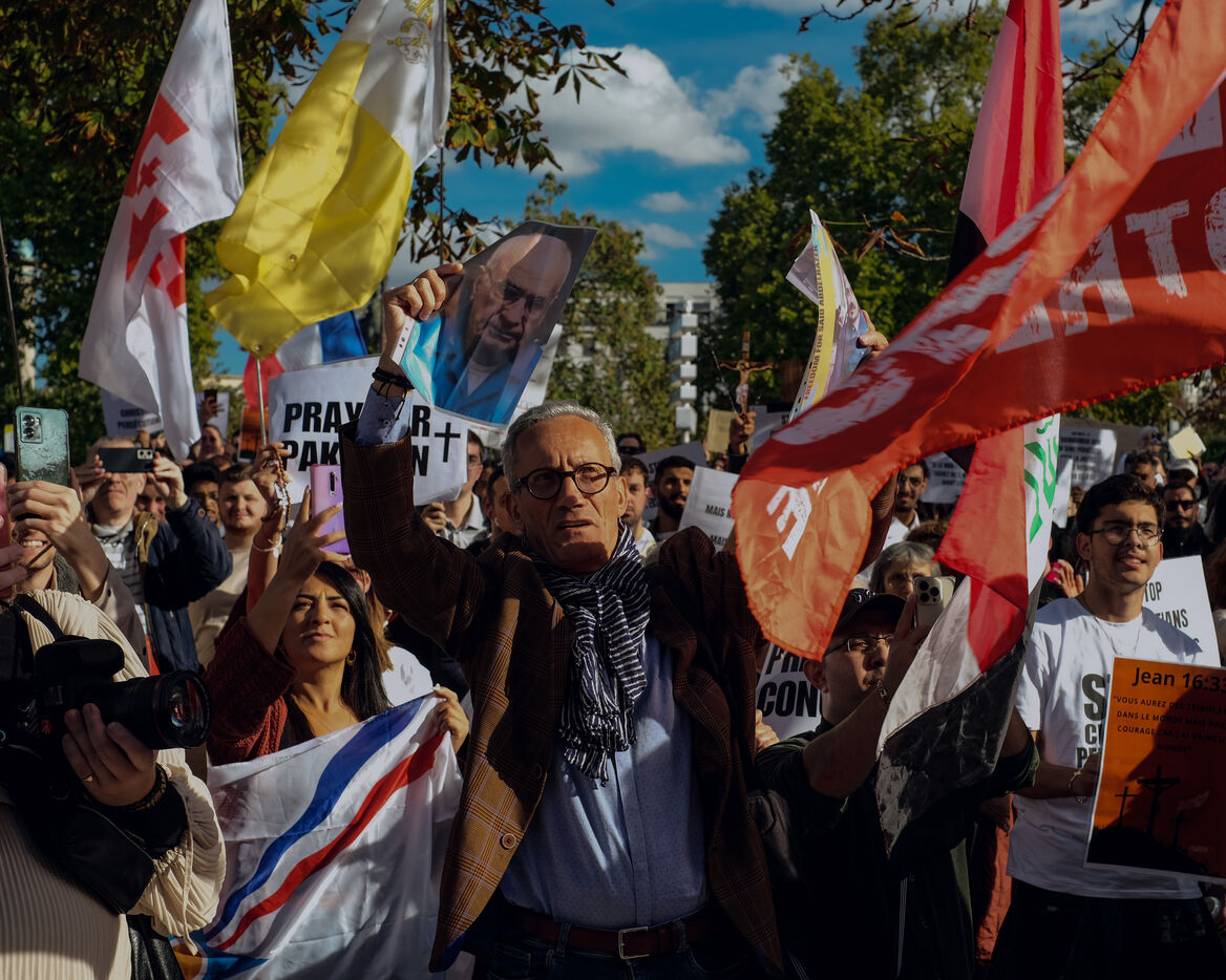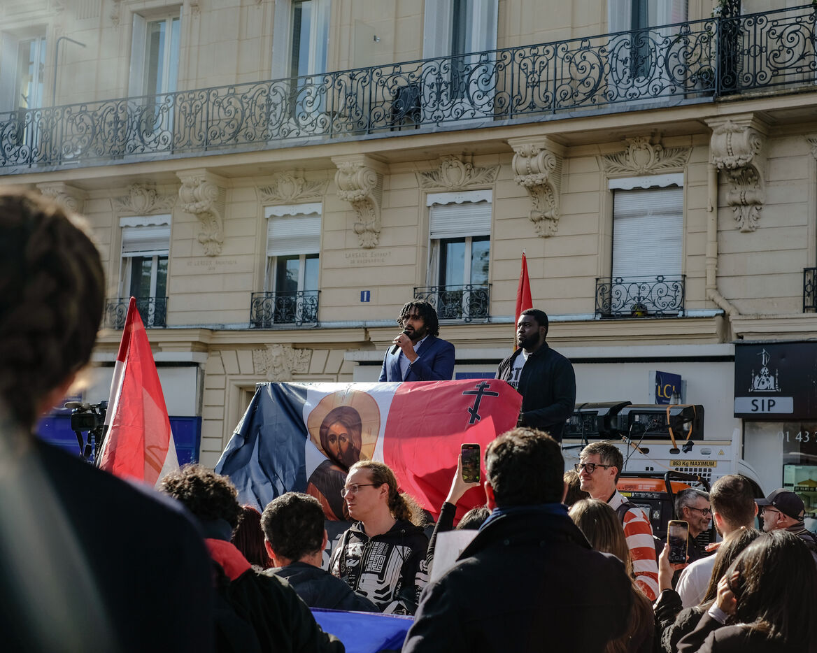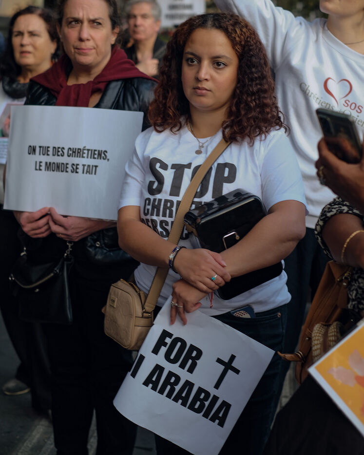 France, Paris, 2025/09/28. Rassemblement contre la christianophobie organisé par diverses associations dont SOS Chrétiens d'Orient pour mettre en lumière la persecution des chrétiens en France et dans le monde.