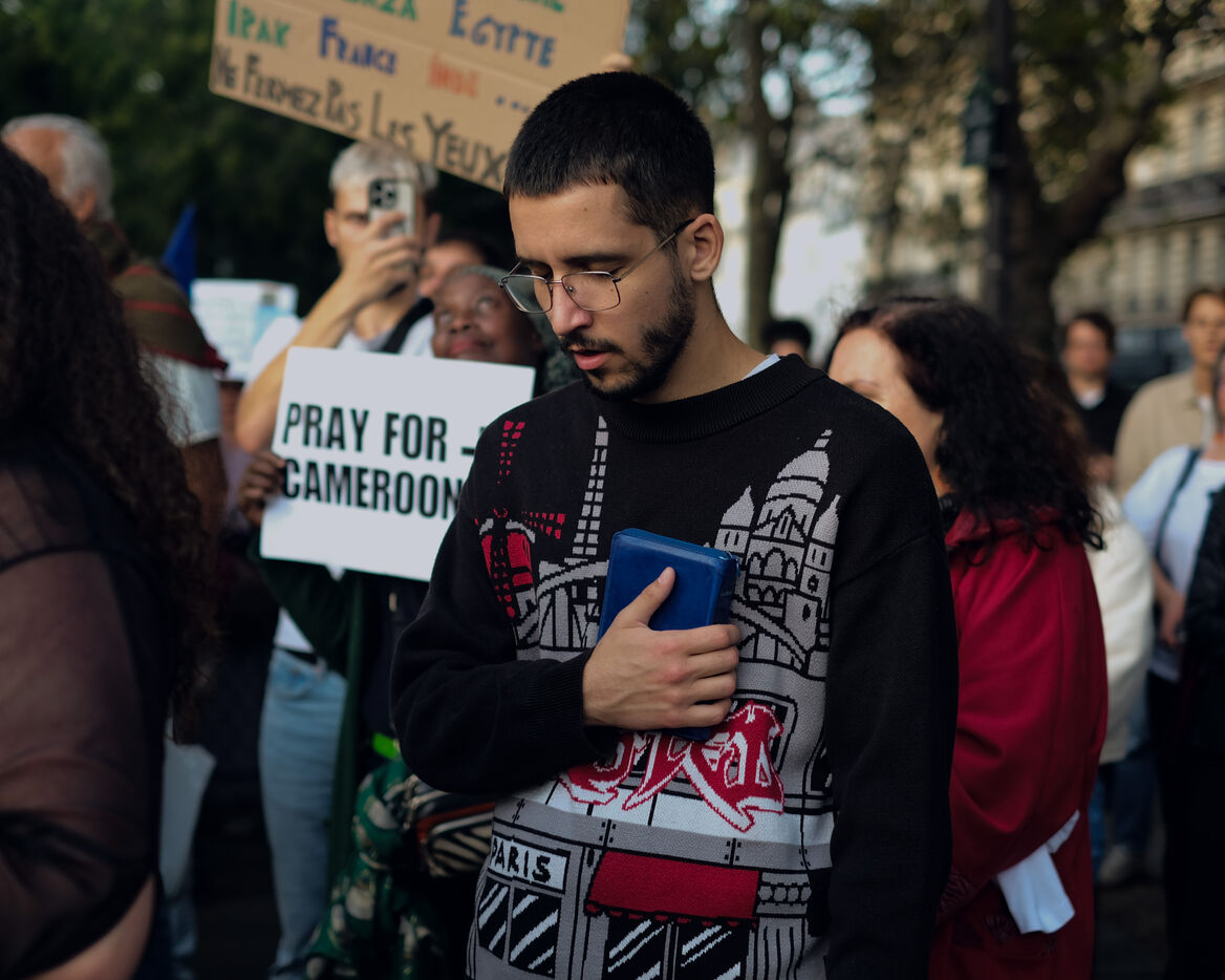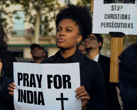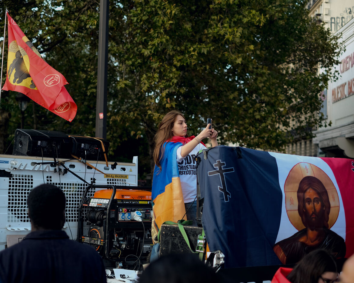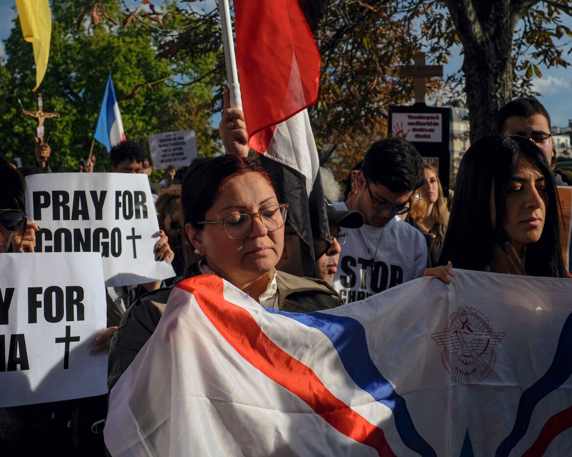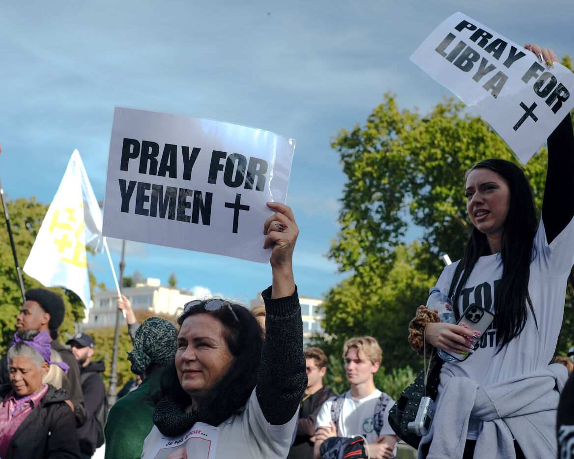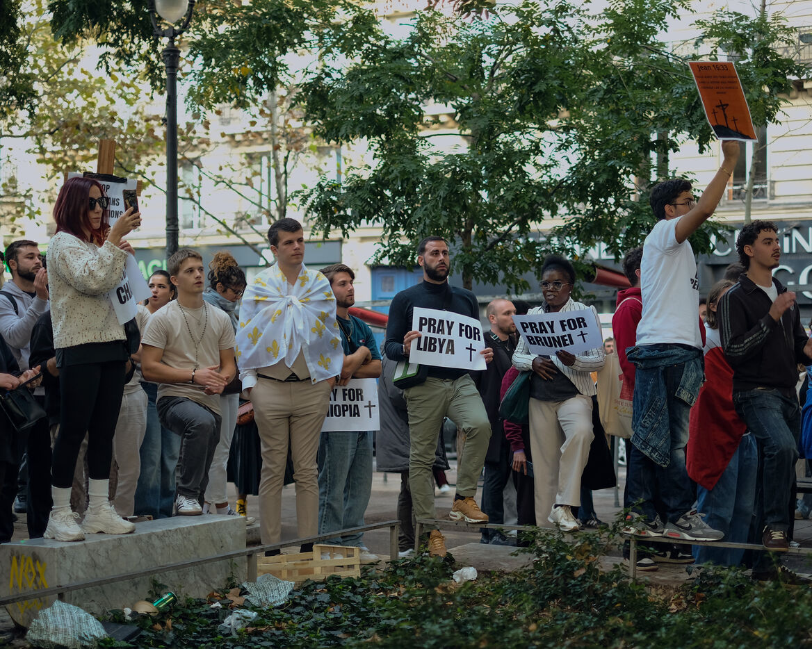 France, Paris, 2025/09/28. Rassemblement contre la christianophobie organisé par diverses associations dont SOS Chrétiens d'Orient pour mettre en lumière la persecution des chrétiens en France et dans le monde.