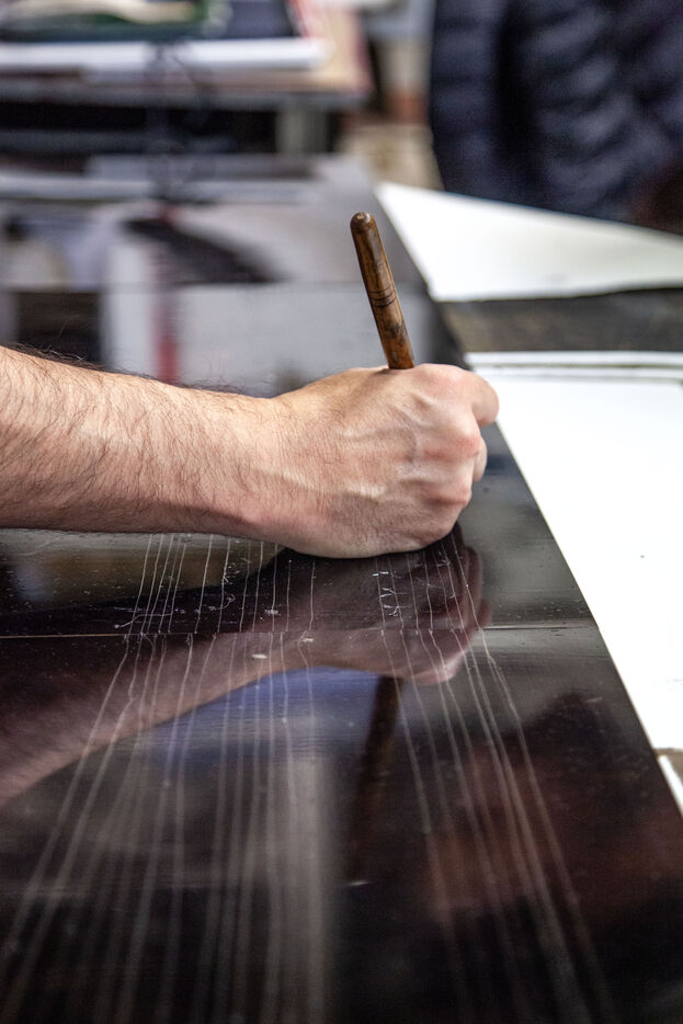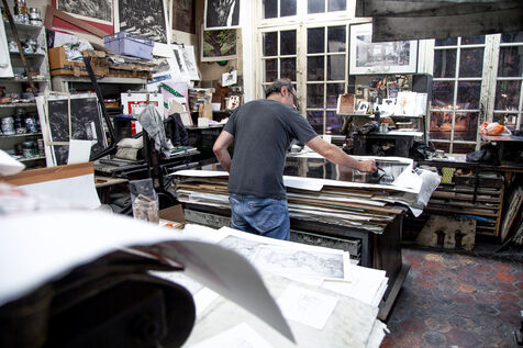 André Moret created his intaglio printing studio in 1947. His son Daniel has since been training apprentices, in whom he instills a love for this artcraft. Located in the heart of the 5th arrondissement, the company has several presses and prints in black or color. It creates original prints from contemporary engraved plates, but also old plates, several institutions and artists therefore work with the studio, such as Cécile Reims, Michel Butor, Pierre Alechinsky, Valérie Jouve.