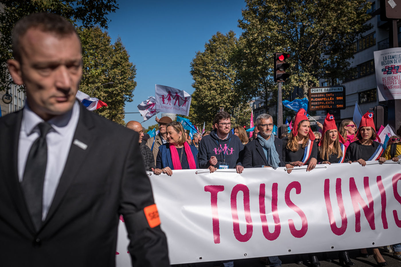 Two years after its last major demonstration, the collective 'La Manif pour tous' and thousands of supporters take to the streets to demand the repeal of the Taubira law on October 16, 2016 in Paris. Many families with children were in the crowd to walk to the Trocadero.