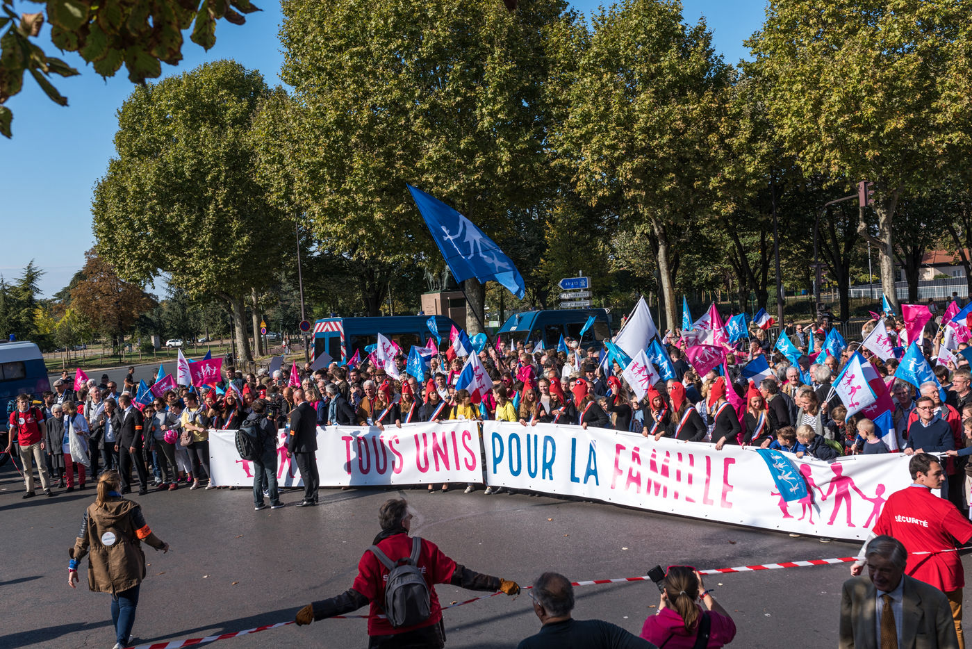 Deux ans après leur dernière grande manifestation, le collectif de " La manif pour tous " s'est réunit pour portester contre la loi Taubira le 16 octobre 2016. De nombreuses familles avec enfants ont fait le déplacement pour défiler jusqu'au Trocadéro.