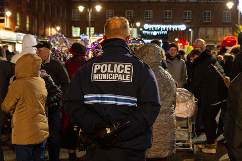 Parade of motorcyclists dressed as Santa Claus in the centre of Abbeville. Abbeville, France, December 21, 2019.