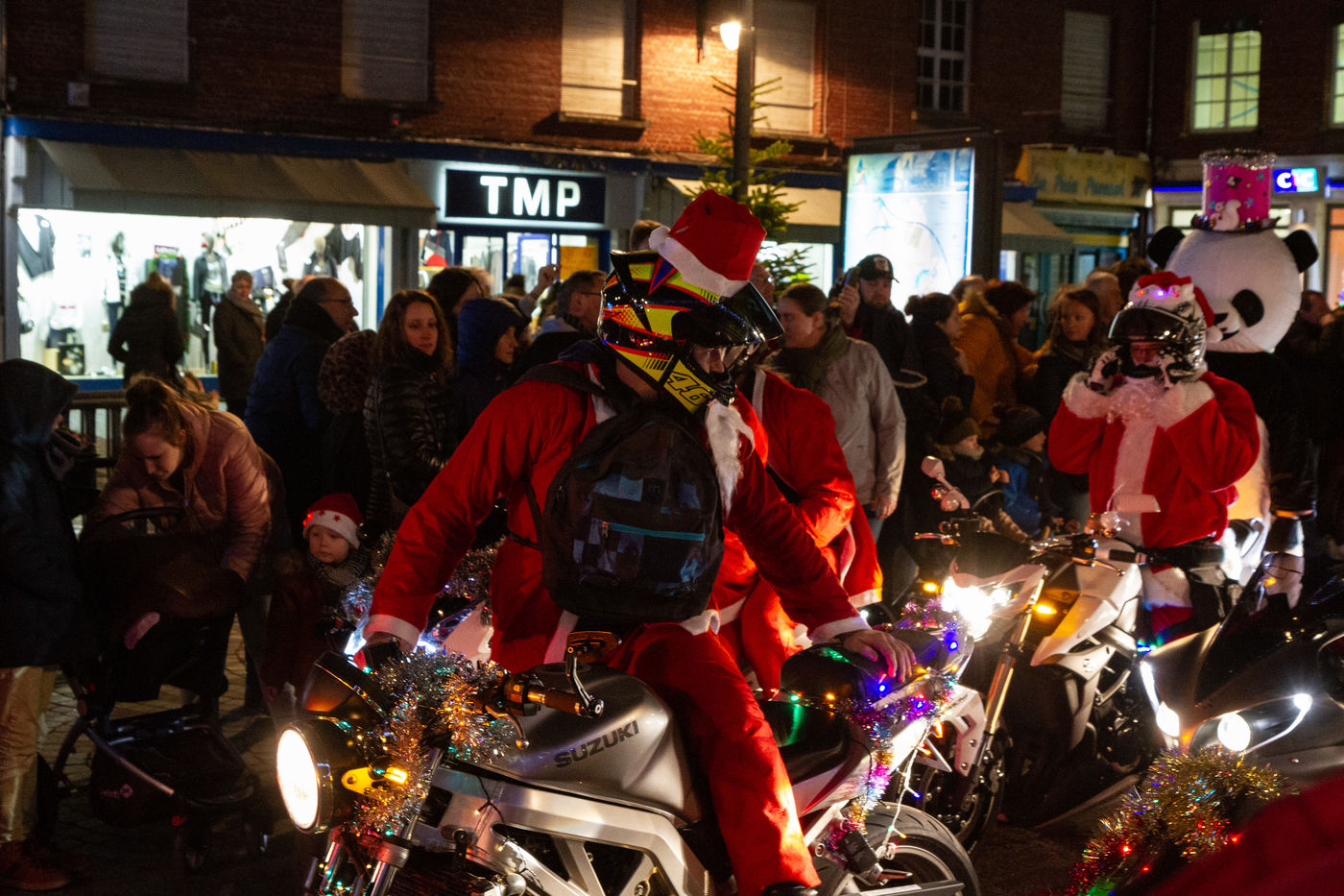 Parade de motards déguisés en Pères Noël dans le centre ville d'Abbeville. Abbeville, France, 21 Décembre 2019.