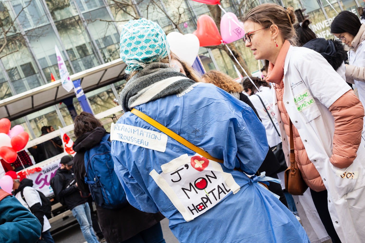 Manifestation nationale du personnel des hôpitaux. En ce jour de Saint-Valentin les hospitaliers font une déclaration d'amour à l'hôpital public. Paris, France, Vendredi 14 Février 2020.