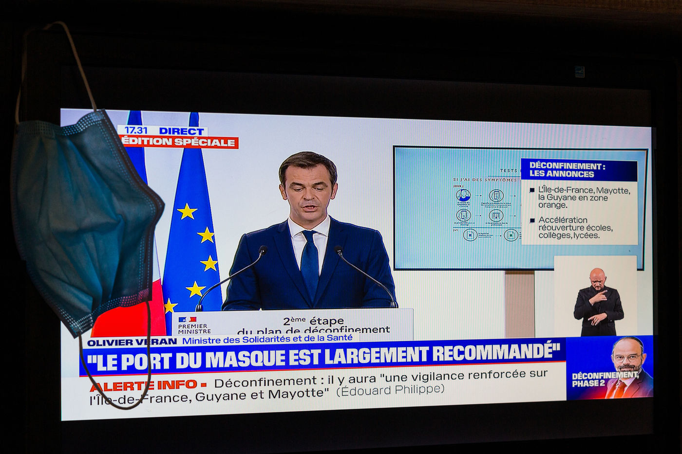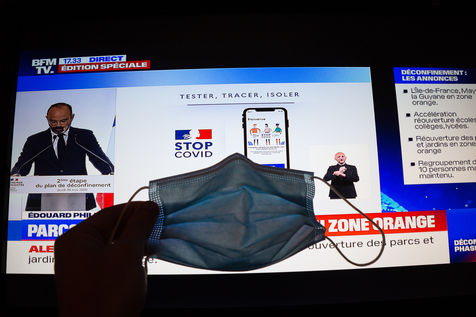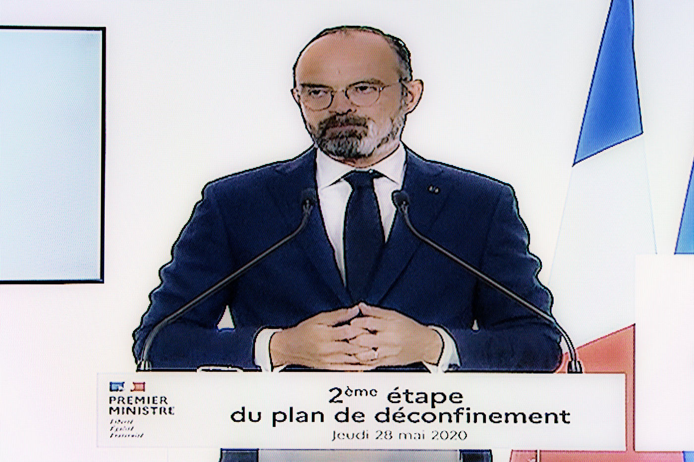 Presentation of the second step of deconfinement plan by prime minister Edouard Philippe broadcast on television. Screen photography. Paris, France, 28 May 2020.