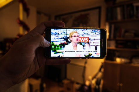 Digital meeting in augmented reality of Jean-Luc Melenchon, for the public liberties, deputy of France Insoumise, candidate for the presidential election of 2022. Photos of a computer screen. Paris, France, Saturday, November 28, 2020.