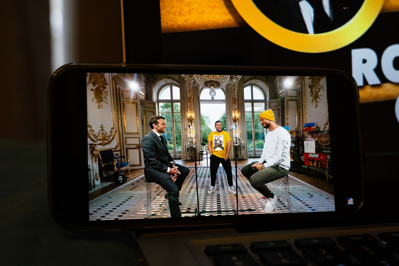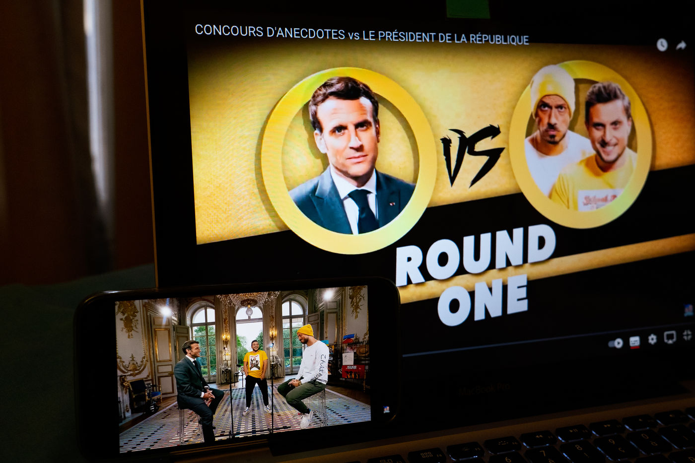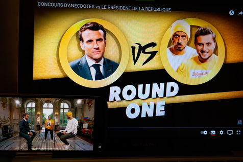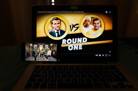 Emmanuel Macron avait promis d'inviter le duo de youtubeurs McFly et Carlito à l'Elysée si leur vidéo pour défendre les gestes barrières atteignait les 10 millions de vues, défi aisément relevé. La vidéo de la rencontre entre les youtubeurs et le chef de l'état sous la forme d'un concours d'anecdotes mise en ligne le 23 Mai 2021 a déjà récolté plus de 10 millions de vues. Photos d'un écran d'ordinateur et de smartphone dans un appartement parisien.