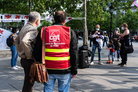 Demonstration at the Place de la Republique called by several collectives and trade unionists of health workers for the lifting of patents on vaccines to fight against the coronavirus epidemic.